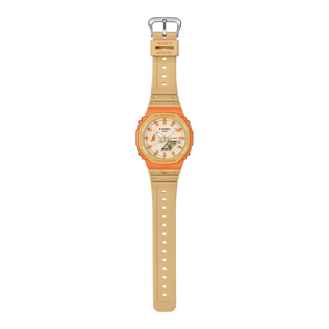 The GA-2110MK is an analog digital watch based on the wildly popular GA-2100 octagonal series. It taps into the "camaieu" color scheme, using neutral, earthy beige and cream tones inspired by Paris' historic Haussmannian architecture. The muted tones are punctuated by a stark orange resin bezel, which Casio says is meant to evoke the sunset glowing over the Paris skyline. The watch ships in special packaging that matches the Camaieu color scheme.