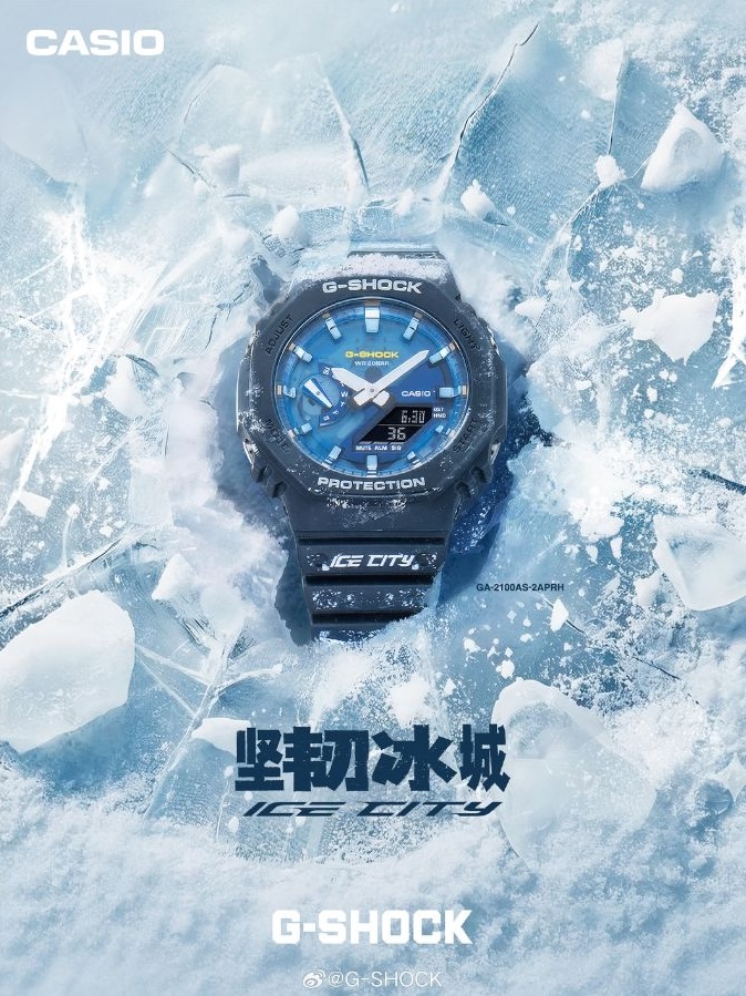 The GA-2100AS-2APRH has an ice and snow-themed design. It is based on the GA-2100AS-2A, released in early 2025, with a navy blue resin casing and strap, and a semi-transparent blue-green dial. This special edition model adds a cracked ice pattern to the band, and the words “Ice City” can be found at the top of the lower strap. Plus, the model comes with a snowflake patterned 'G' pin and custom packaging.