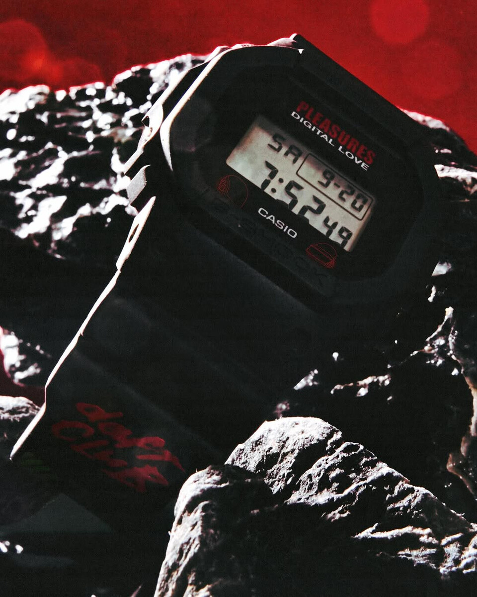 Pleasures has revealed its upcoming limited-edition timepiece in collaboration with Daft Punk and Casio G-Shock, and it is slated for release on October 9th at 10AM PST, exclusively via pleasuresnow.com. This collaboration draws direct inspiration from Daft Punk’s iconic, era-defining visual style and musical legacy - and all of it is quite apparent in the design cues visible throughout the watch. The watch features 'Digital Love' branding in red on the display (a reference to Punk’s popular track, Digital Love, from the album Discovery), while the duo's helmet designs are present on the lower bezel.