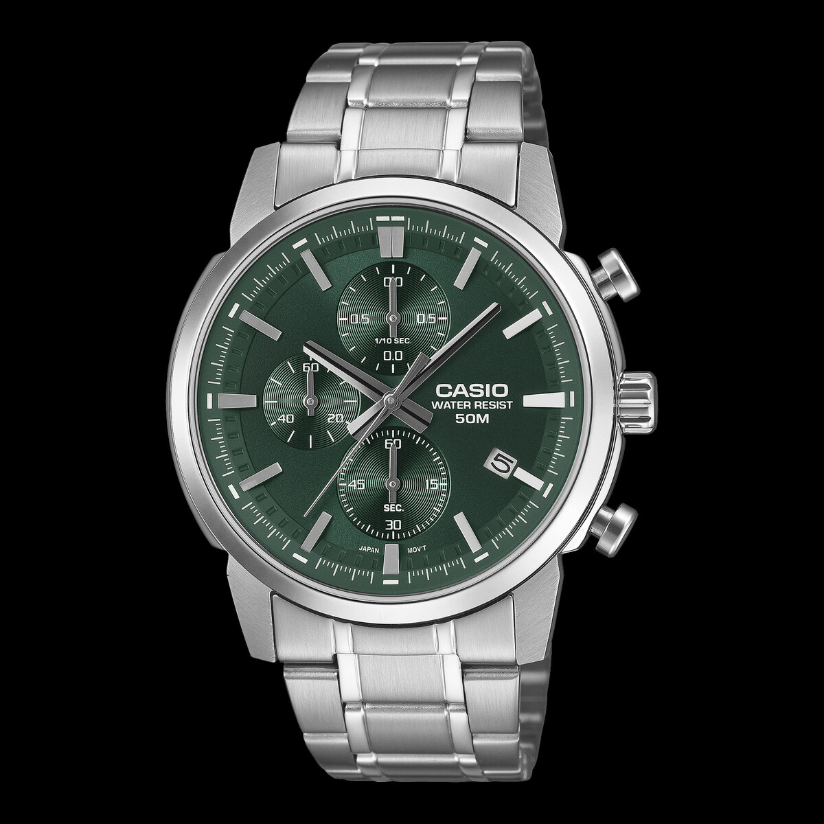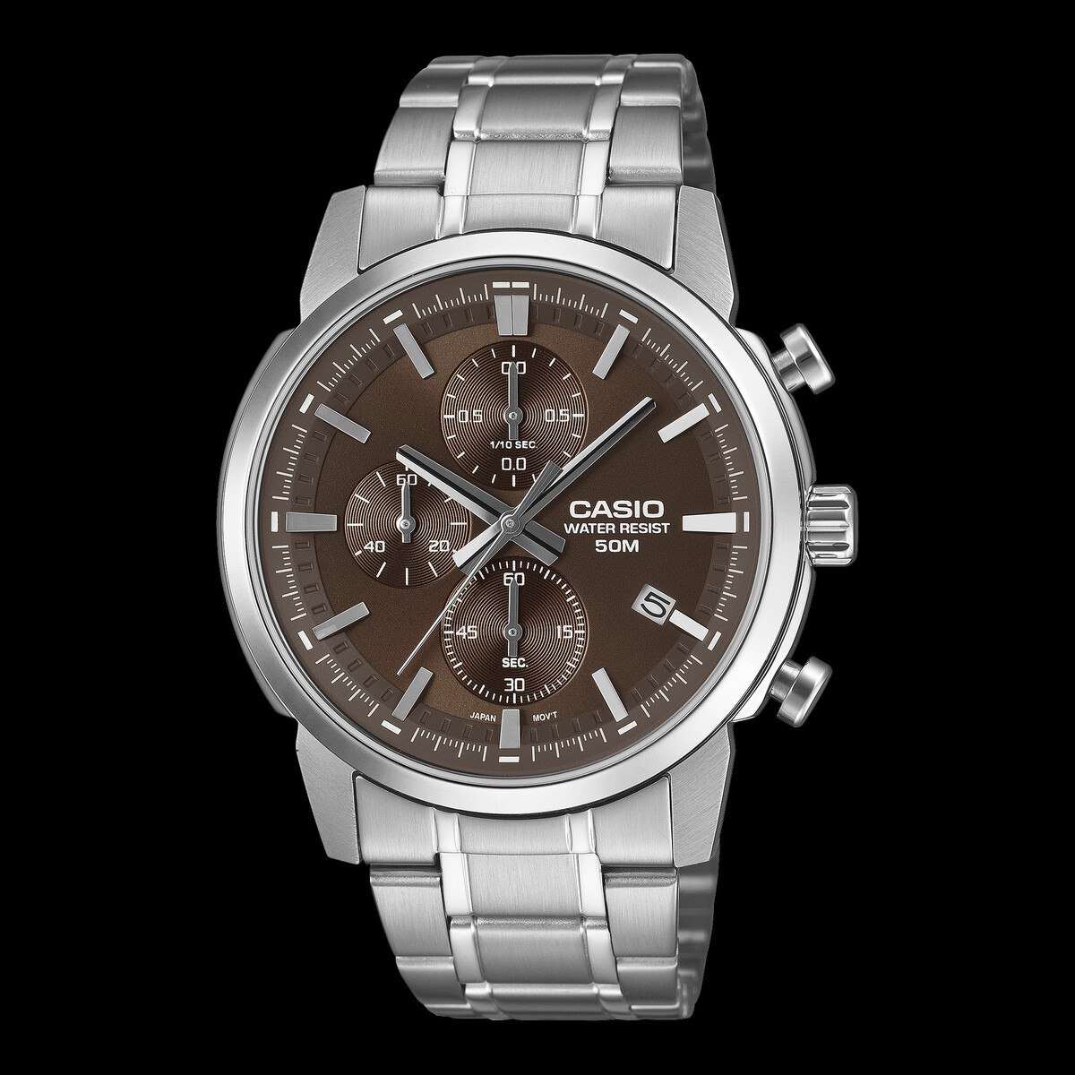 Beyond basic timekeeping, you get a precise chronograph with 1/10 second accuracy. Subdials display minutes at 9 o'clock, seconds at 6 o'clock, and tenths of a second at 12 o'clock. Again, this is rare for Casio’s Standard series, which helps the MTP-E510D have its own separate design language from entry-level quartz watches. However, it’s worth stressing these are not premium pieces. The stainless steel case and bracelet (with non-solid links) keep costs low without sacrificing the appearance of sturdiness. Dimensions are a middle ground at 47.5 × 42 × 10.5 mm - meaning these watches should fit most wrists without looking oversized.