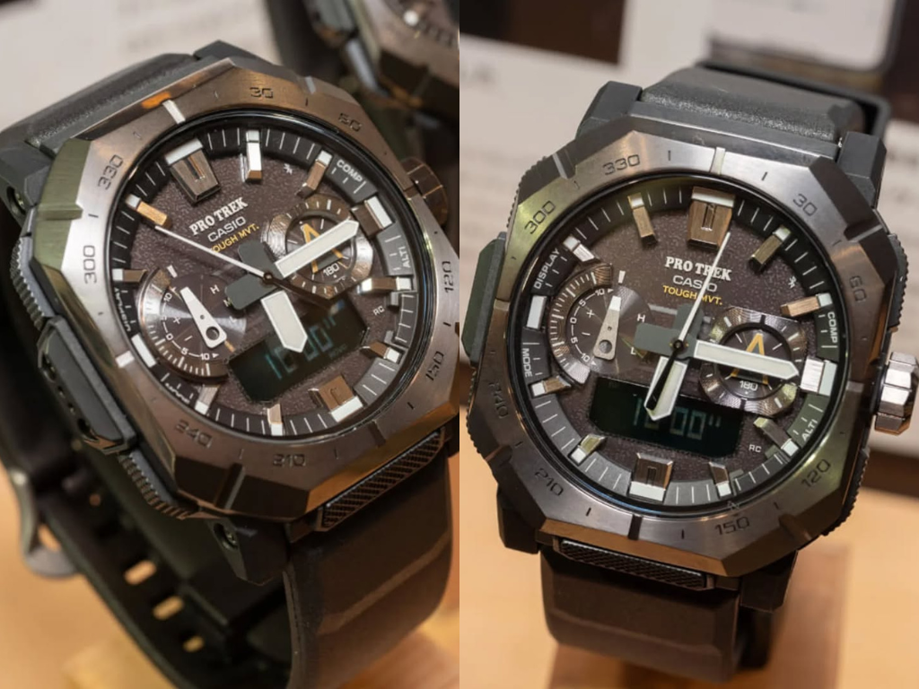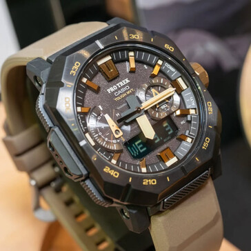 Even in these IRL images, the PRW-B1000's hybrid analog/digital dial is visible, with clear indications for compass, thermometer, and barometer functions, all part of Casio's established Triple Sensor suite. Bluetooth app connectivity and solar charging are confirmed by the official material as well. The watch has atomic timekeeping (Multi-Band 6) and a case size measuring roughly 50.8 x 48.5 x 14.9 mm.