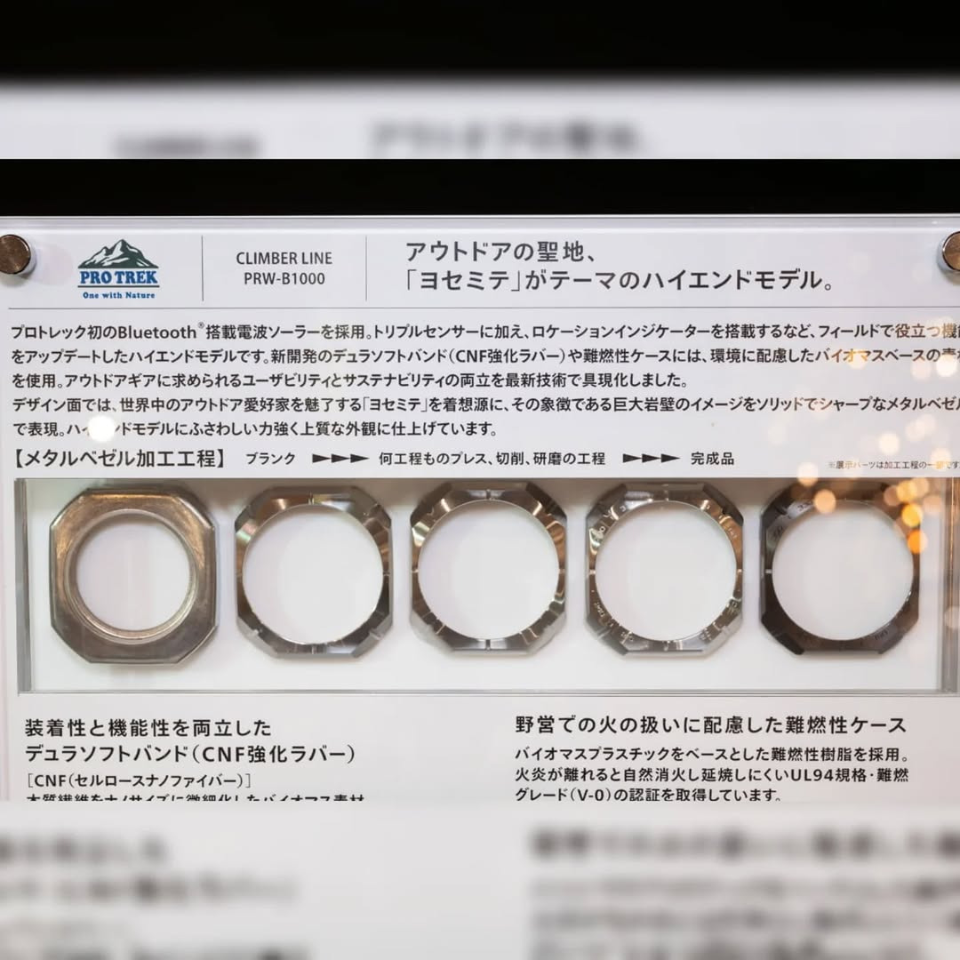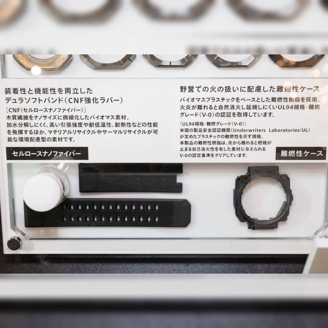The showcase also reveals Casio's use of cellulose nanofiber (CNF) reinforced rubber for the band for superior wear resistance and eco-friendly bioplastic integration. Dedicated display text highlights the watch strap and casing's flame-resistant certification, achieved by using UL94 V-0 grade materials - important for safe field use.
