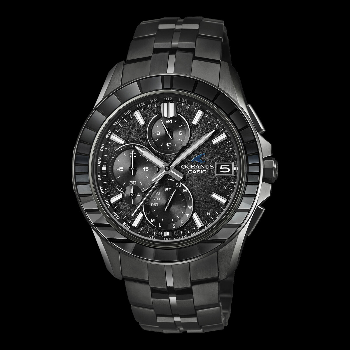 Casio has also used its Gallium Tough Solar system, reportedly boosting efficiency fivefold compared to conventional Tough Solar by using gallium-based connections in place of silicon - technology also found in advanced aerospace applications. Daylight enters the dial through a date indicator ring to charge the watch. Titanium with DLC coating is used throughout, including a caseback engraved with a relief of the moon's surface on the OCW-SG1000CN.