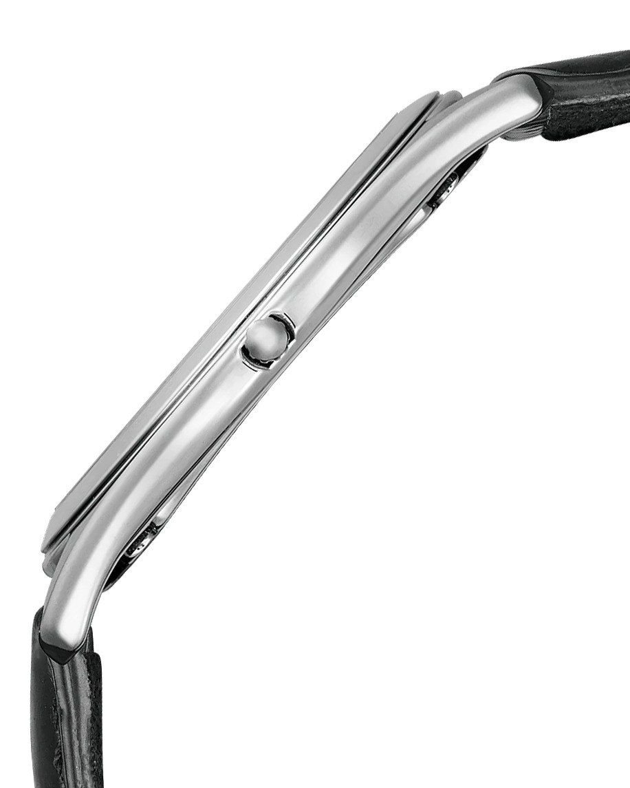 The AQ5010-01A uses a 36.6mm case diameter, which is moderate and fitting for formal occasions. The watch has a bright white dial, golden handset, and a black small seconds sub-dial that gives the face a layered feel. The chapter ring is framed in black, which gives the dial a strong contrast without losing out on legibility. All this is paired with a glossy black leather strap embossed with a crocodile pattern.