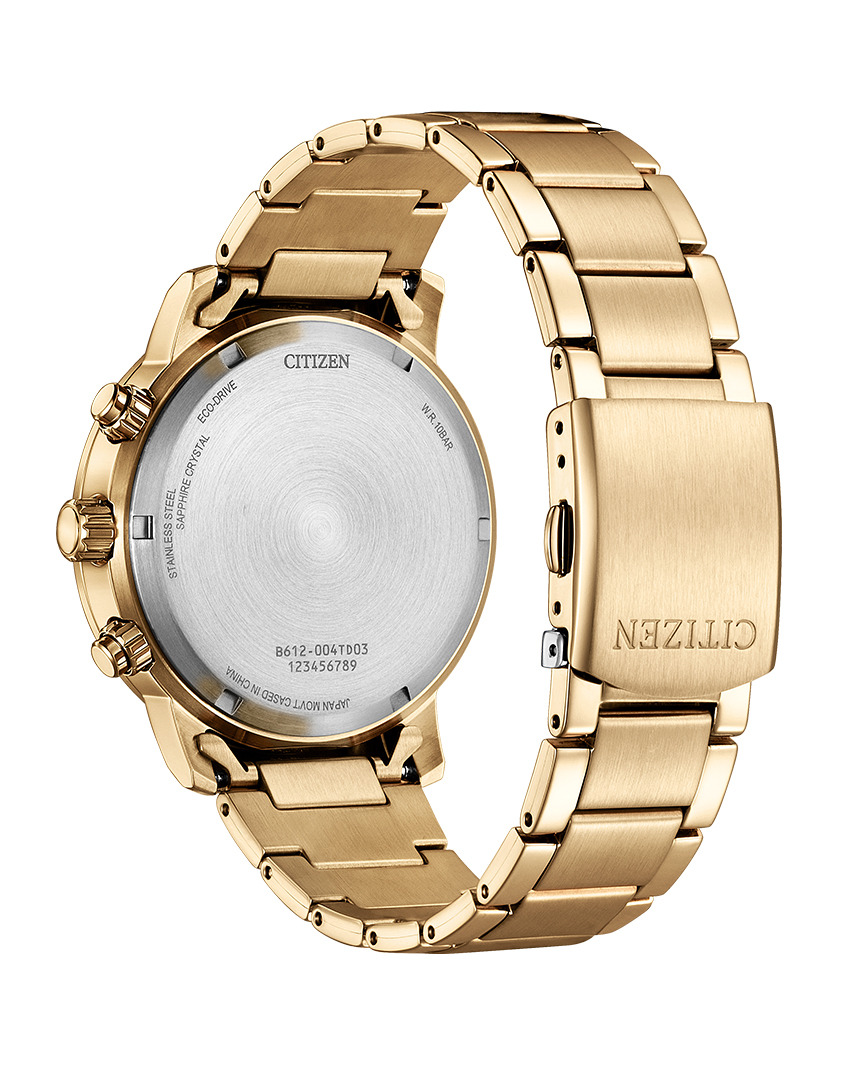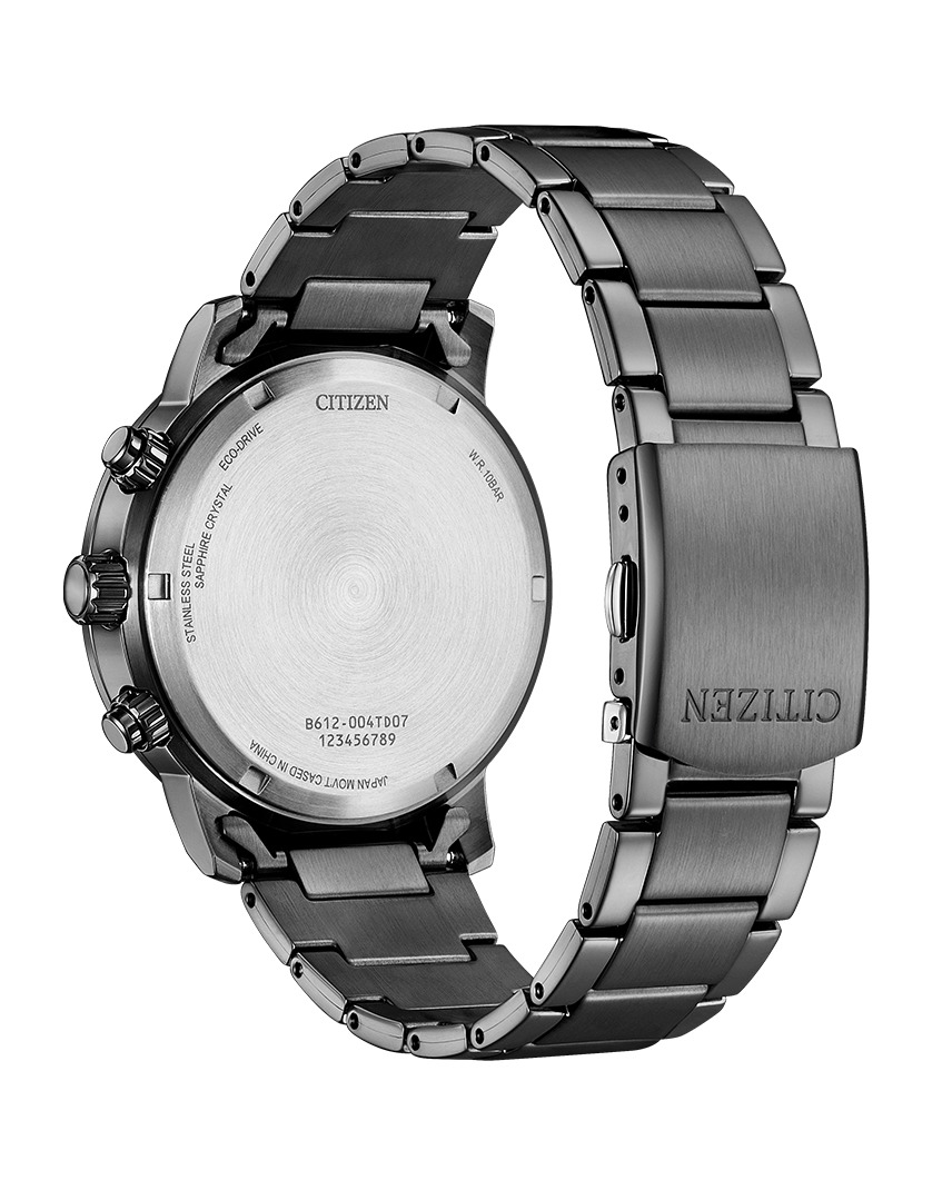 Both watches use a 43 mm stainless-steel case that is 11.5 mm thick, which keeps the profile wearable despite the large chronograph layout. They run on the Citizen B612 Eco-Drive solar calibre, which removes the need for battery replacements and drives the chronograph, date display at 3 o’clock, and three-subdial layout. A tachymeter scale sits around the outer rim, with a tool-style design even though these models are positioned for daily use instead of sport timing.