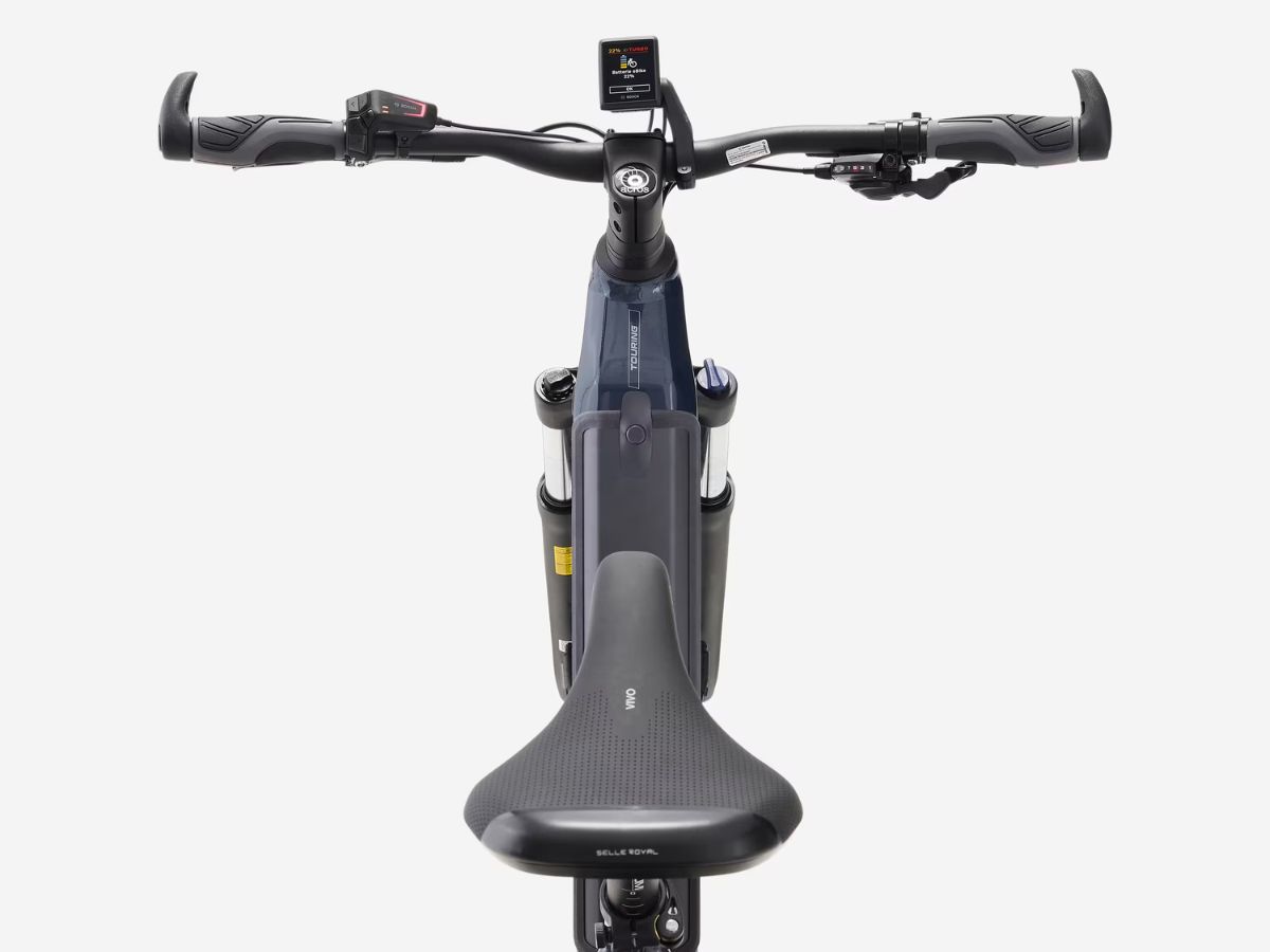 Decathlon’s new Stilus E-Touring e-bike has a low, step-through frame, whereas its predecessor was a high frame model. Like the older versions, the new model is powered by a Bosch Performance Line CX motor with up to 85 Nm torque, for a top assistance speed of 25 kph (~16 mph). This is accompanied by a removable 750 Wh Bosch PowerTube battery, said to deliver up to 130 km (~80.8 miles) assistance range in Eco mode.