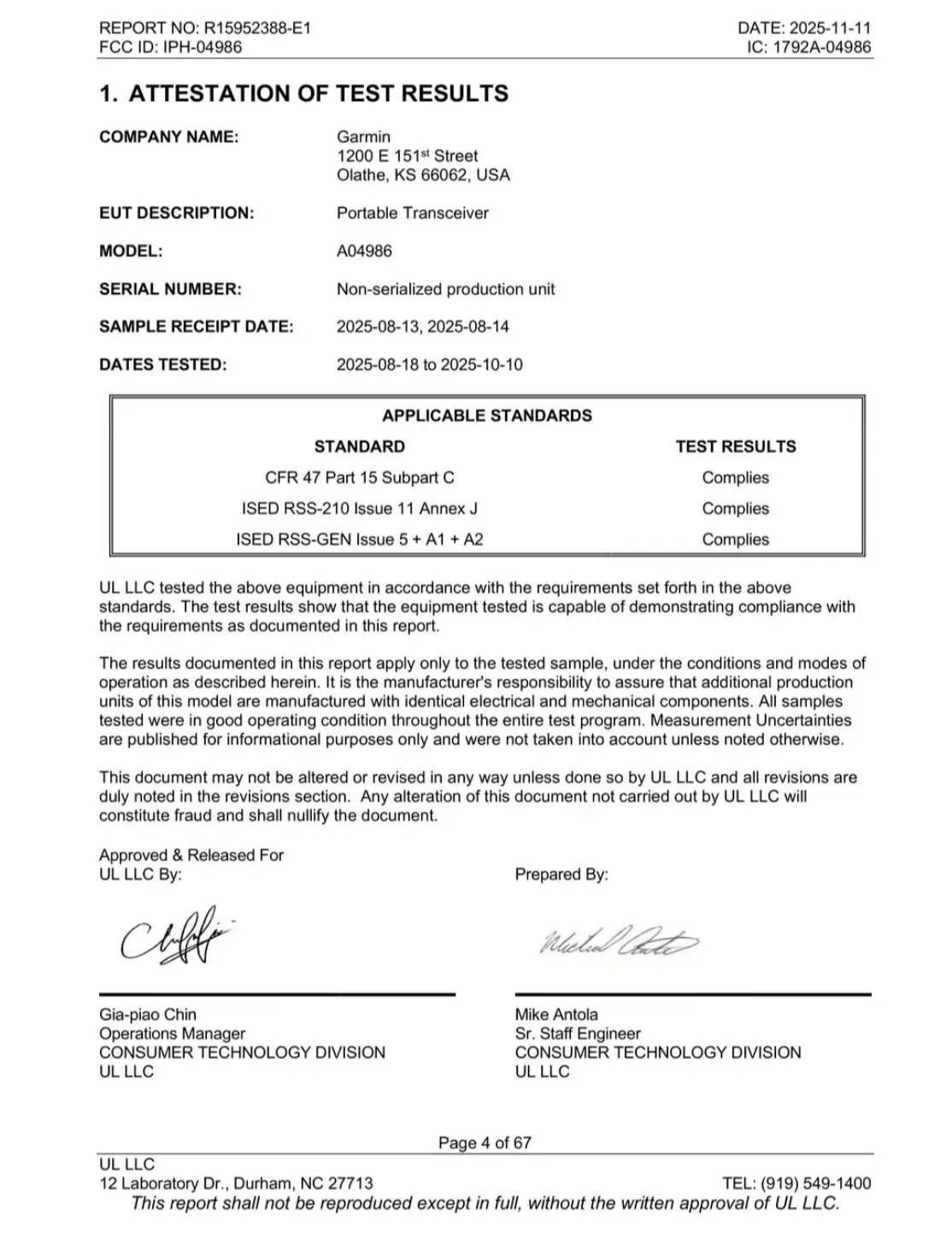 Now, the Federal Communications Commission (FCC) has published initial documentation for a mysterious Garmin device bearing the model number A04986. Described as a portable transceiver throughout, the Garmin A04986 supports expected connectivity found across most Garmin devices, like ANT+ and Bluetooth Low Energy. In that sense, the unnamed device should be compatible with Garmin Connect.