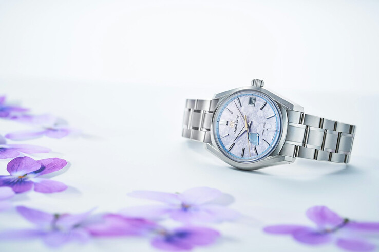 The color palette references the "Sumire" (violet) flower. The dial features a soft violet-grey tone, alongside a blue power reserve indicator and a blue perimeter ring. Thanks to gold-toned elements, including the GS logo and the seconds hand, we get a sharp contrast against the textured "Hana-ikada" pattern, which is intended to mimic cherry blossoms floating on water.