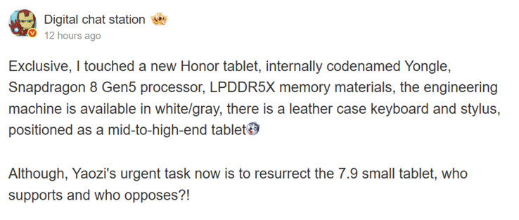 As the screenshot below shows, Digital Chat Station does not name the unreleased Honor tablet. Instead, they refer to its codename, Yongle. Nonetheless, the chipset in play indicates that 'Yongle' will replace the MagicPad 3 or the Pad GT2 Pro rather than the MagicPad 3 Pro. Specifically, Honor is said to have equipped 'Yongle' with the Snapdragon 8 Gen 5 that underpins the OnePlus 15R (curr. $699.99 on Amazon).
