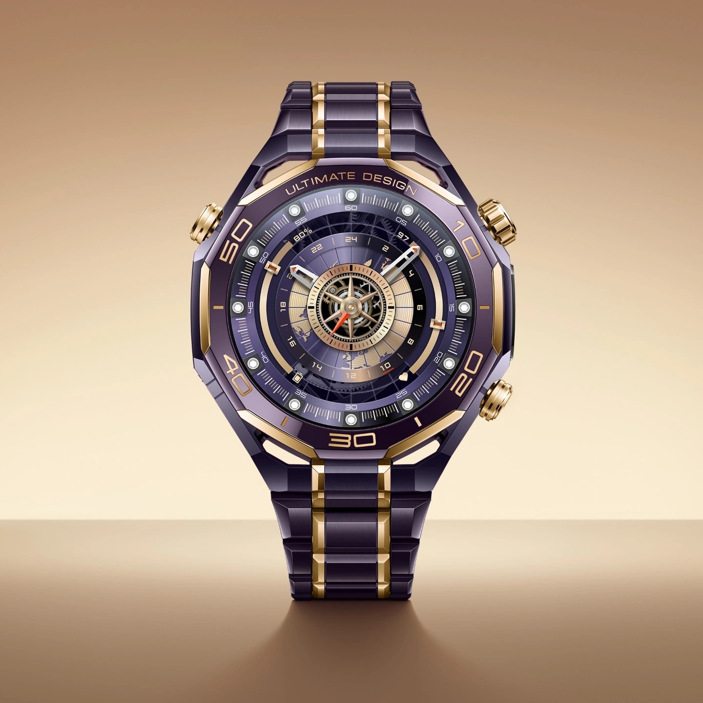 The Watch Ultimate Design Royal Gold Edition is described by Huawei as “a crown jewel on the wrist”. It has a predominantly purple design, with a 12-sided ceramic bezel, and 18K and 24K gold elements. The purple casing is made from a zirconium-based liquid metal, and there is a matching purple titanium alloy strap with 24K gold plating. The screen is protected by sapphire glass, and the watch measures 48.3 x 48.3 x 12.9 mm (~1.90 x 1.90 x 0.51 inches) and weighs 80.9 g (~2.85 oz).
