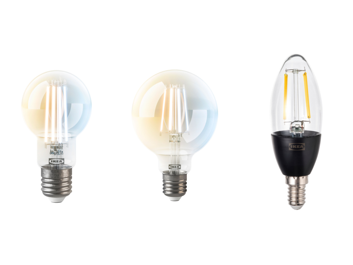 IKEA’s Kajplats line-up has two GU10 directional spotlights, a color and white spectrum model with up to 370 lumens brightness, and a white spectrum variant with up to 575 lumens brightness. Finally, there are three clear glass decorative bulbs. E14 and E27 standard globe 60 mm (~2.4 inch) options have 470 lumens brightness, while the larger E27 large globe 95 mm (~3.7 inch) delivers up to 810 lumens.