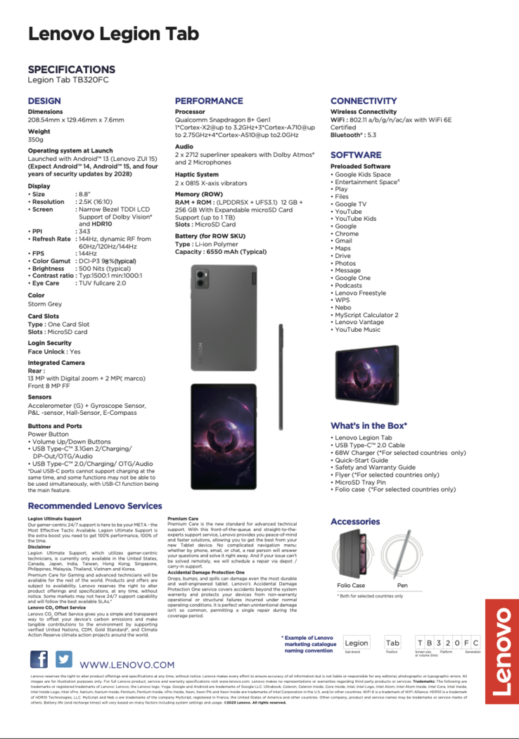 To recap, the Legion Y700 (2023) arrived towards the end of July 2023 with a few upgrades over the model of the same name that debuted over a year earlier. As the specification sheet below shows, the Legion Tab relies upon a Snapdragon 8 Plus Gen 1 chipset, a 6,550 mAh battery and a 144 Hz display that measures 8.8-inches across, just like the Legion Y700 (2023). In another similarity with the Legion Y700 (2023), the Legion Tab will ship running Android 13 (ZUI 15) with the promise of Android 14, Android 15 and security updates until 2028.