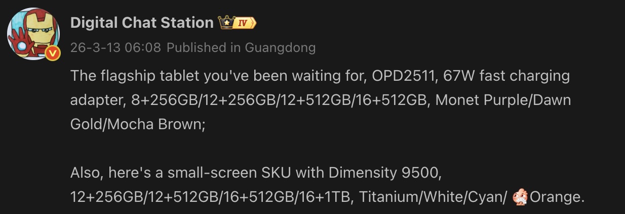 One of them is a tablet that carries the model number "OPD2511." However, the leak does not reveal the exact name of the device. The tipster revealed that it will come in four memory configurations: 8GB/256GB, 12GB/256GB, 12GB/512GB, and 16GB/512GB. The upcoming Oppo flagship tablet is said to be available in Monet Purple, Dawn Gold, and Mocha Brown colorways. The leak also hints at 67W fast charging support.