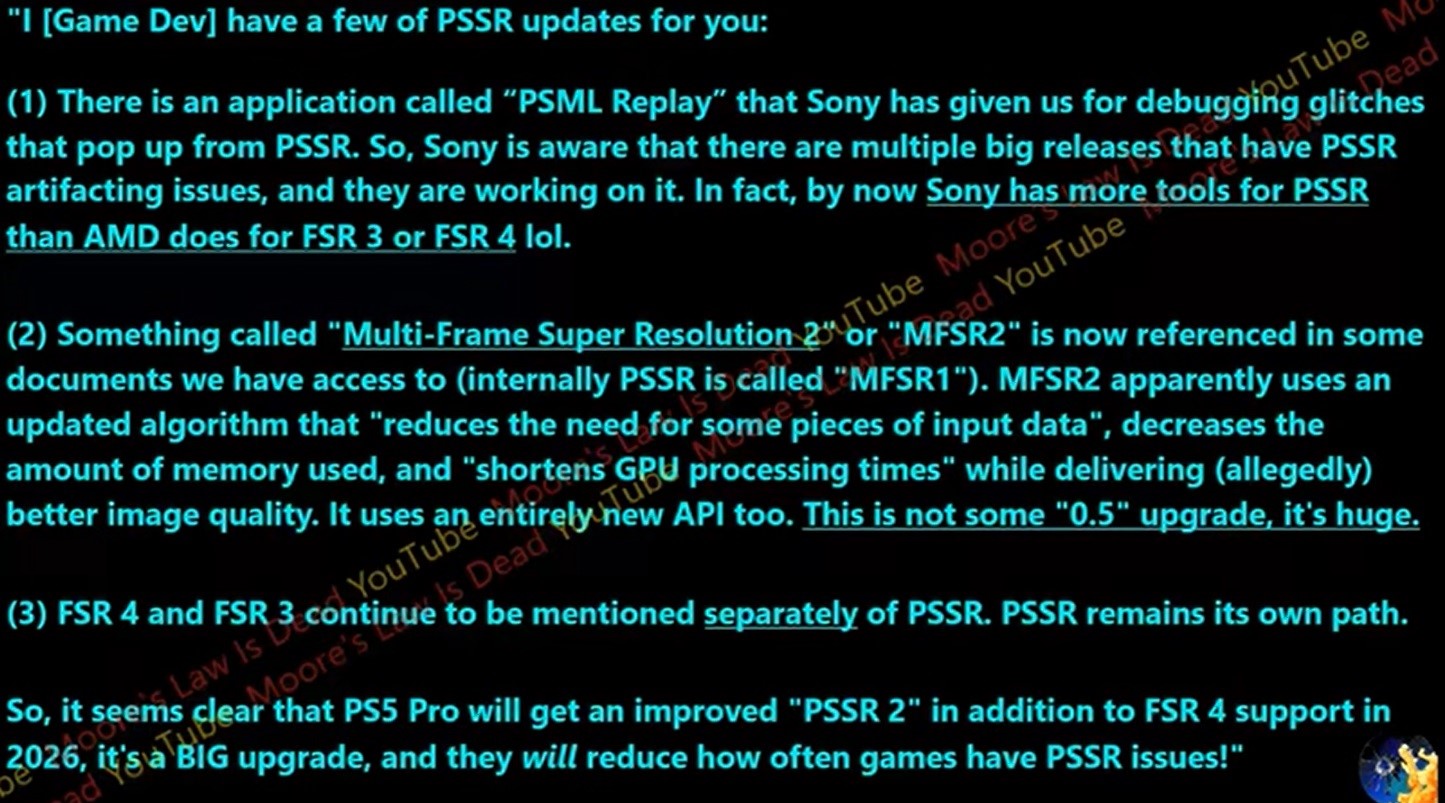 The leaker claims that the PSSR2, which is internally referred to as the Mult-Frame Super Resolution 2 or MFSR2, uses a new algorithm and brand new APIs. PSSR2 reportedly aims to deliver huge image quality improvements over PSSR while reducing “GPU processing time” and using less memory. MLID’s source alleges that PSSR2 is not just a minor “0.5” update but a “huge” one.