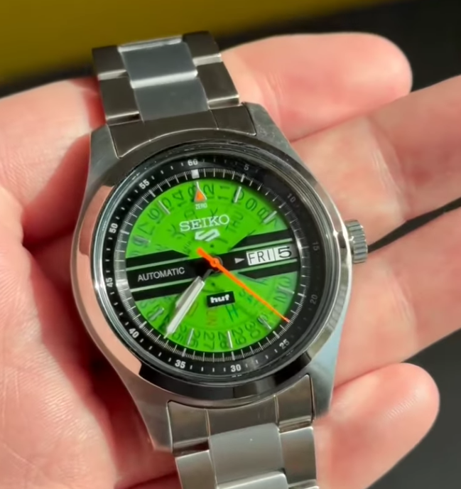 The newly spotted hands-on images, thanks to @SeikoLeaks on YouTube, give us a practical look at how the "HUF Green" acetate dial interacts with light. As expected, there is a high degree of transparency that exposes the mechanical day and date wheels beneath the surface. The dial execution, inspired by the 1970s "Time Sonar," creates a layered, three-dimensional effect which isn't normally seen in the entry-level Seiko 5 line. While promotional renders often sanitize these textures, the physical shots reveal a unique industrial character, with the black horizontal "Automatic" bar and "huf" logo at 6 o'clock appearing to float above the green disk.