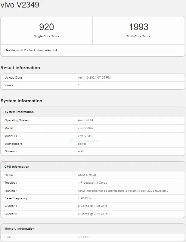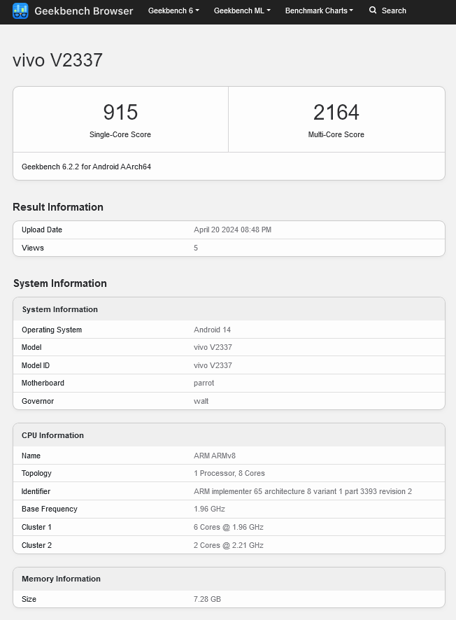 It has allegedly popped up as the Vivo V2349 (confirmed as the V30 SE's real model number by the Bluetooth Special Interest Group (SIG)) in a Geekbench listing that looks like an exact replica of that of the Android 14-powered, 8GB RAM V40 SE (or V2337) - with 1 crucial difference.