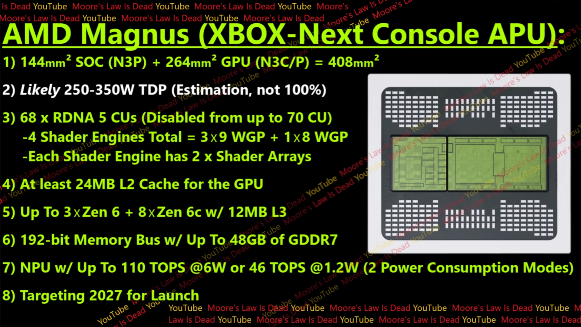 An earlier leak by YouTuber Moore's Law is Dead shed some light on the Magnus SoC slated to power the next Xbox. It boasted of some lofty specs, such as 68 CUs (Compute Units) and an unspecified amount of memory on a 192-bit bus. Tom's newest video now sheds light on everything Xbox Magnus has to offer.