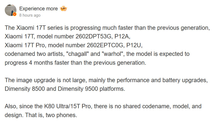 Instead, they assert that the Xiaomi 17T Pro and Redmi K90 Ultra are two distinct smartphones. Writing on Weibo, Experience more expects that both the Xiaomi 17T Pro and Xiaomi 17T are 'four months ahead of the previous generation. Therefore, we may see the Xiaomi 17T series making its global debut in mid to late May 2026 rather than September 2026.
