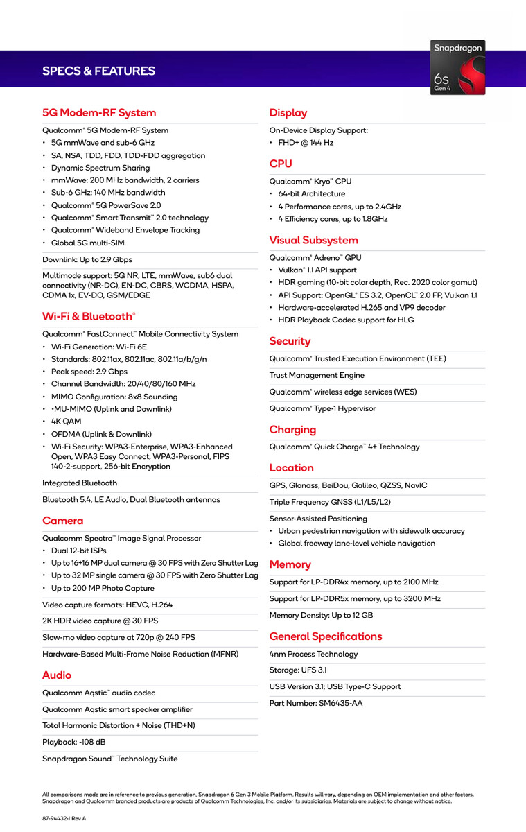 In fact, the Snapdragon 6s Gen 4 offers the same CPU layout and clock speeds as the Snapdragon 6 Gen 3. With that being said, the former jumps to 144 Hz and 1080p display support, with Bluetooth 5.4 connectivity offered too. Please see Qualcomm's product brief below for more details.