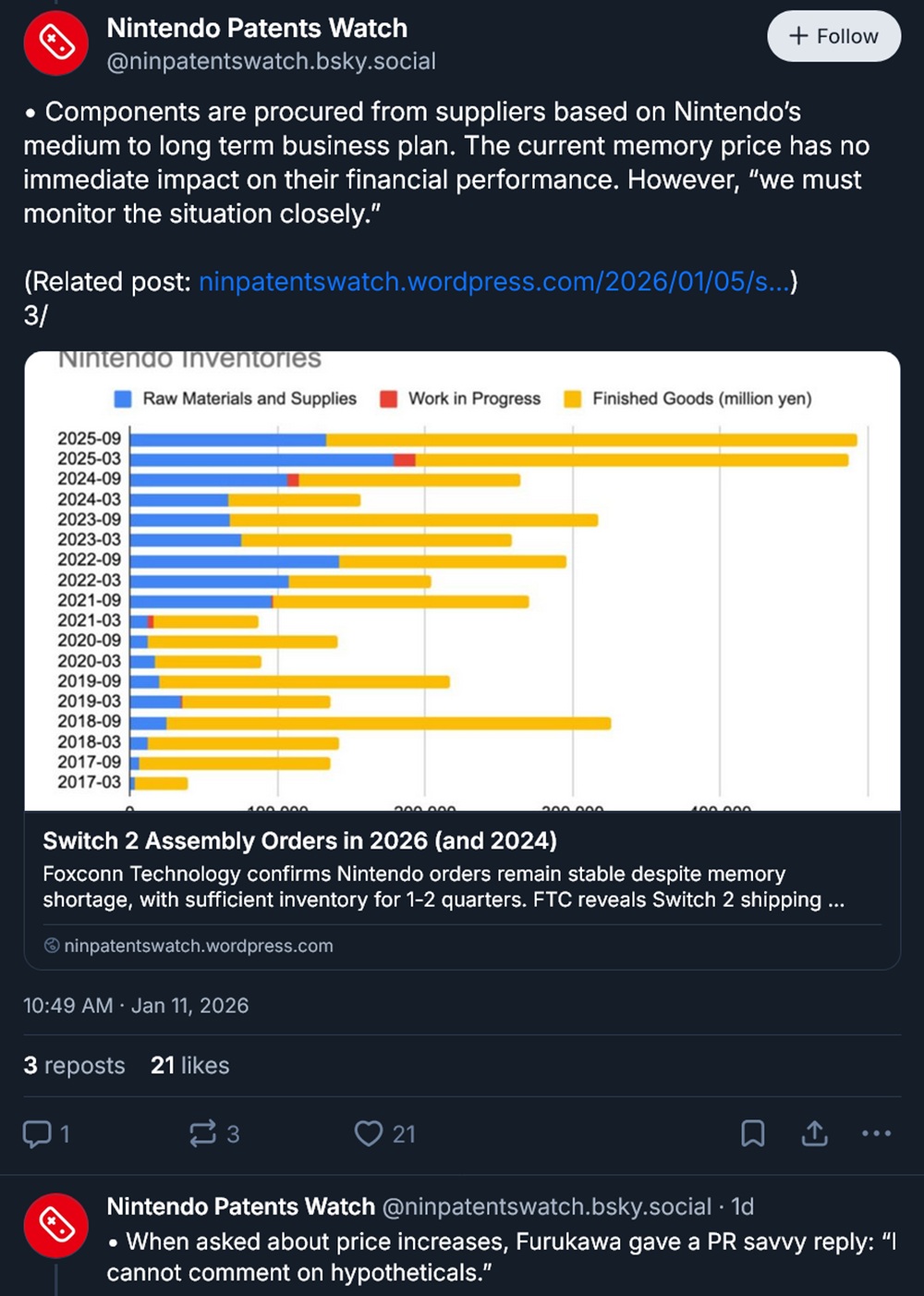 Nintendo President Shuntaro Furukawa provided clues about how the company will respond to higher memory prices. In the interview, he claims Nintendo is not immediately affected by changes in component costs. Nevertheless, the executive didn’t rule out a future Switch 2 price increase.