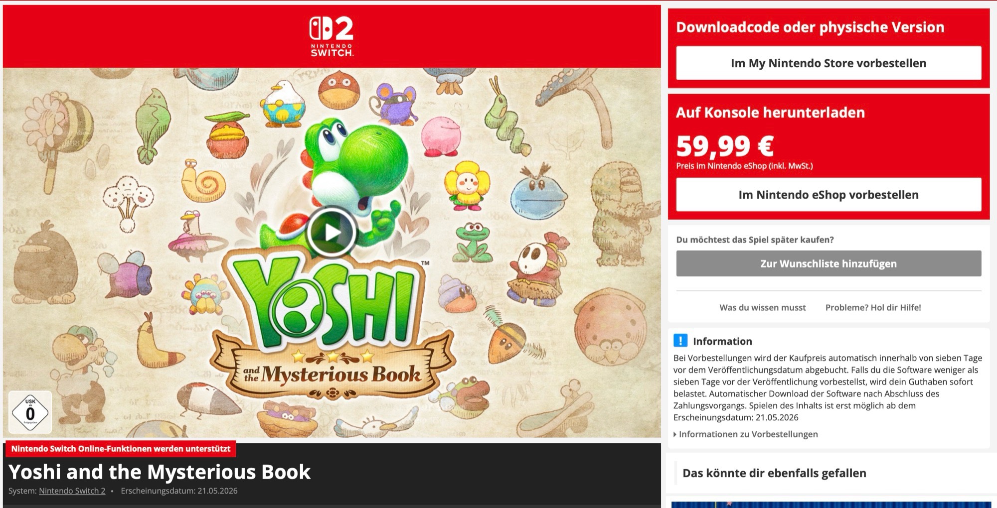 Yoshi and the Mysterious Book is the first title to use this new pricing model. The game will be released in May and can currently be pre-ordered in the Nintendo eShop for $59.99. The RRP of the retail version is $69.99. Nintendo emphasizes that games offer the same content and the same gaming experience, regardless of whether they are purchased digitally or on a cartridge. This change is intended to reflect the "different costs of production and distribution", which makes perfect sense, as game modules not only require expensive memory chips, but a margin must also be factored in for retailers.
