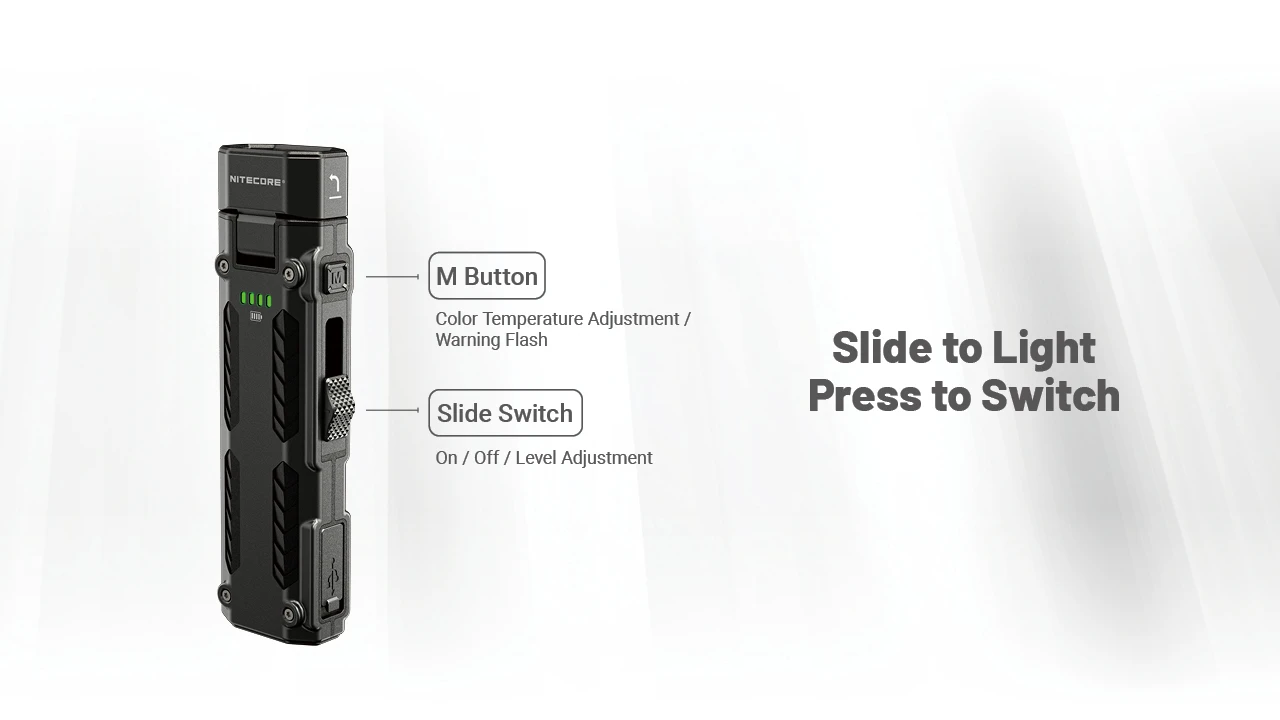 The EDC features MCT (Multicolor Turntable), which allows you to change the light color by mixing two LED types. This is similar to the Tini 3 (review, in German only). You can choose between 3,000, 4,500 and 6,500 Kelvin. Nitecore also provides CRI (Color Rendering Index) values. The warm light at 3,000 Kelvin is particularly good with a CRI of 97. The neutral white and cool white light have CRIs of 83 and 73, respectively. Switching between the two modes is done by simply pressing a dedicated button on the side. Holding the switch down activates a 5-hertz warning light. The light itself is activated in three stages using a slide switch, like on the EDC17.