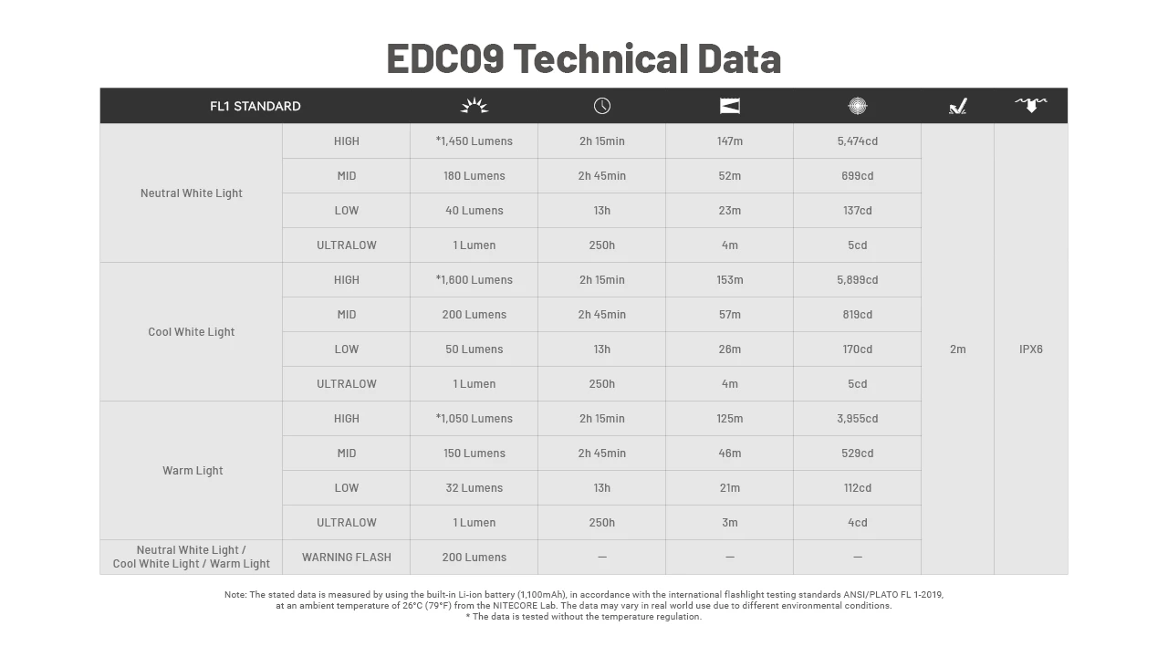The flashlight is IPX6-rated, just over 10 cm long and weighs 114 grams, including the battery. The battery is not replaceable and is charged via USB-C, allowing the flashlight to be used while charging. The battery life is 2 hours and 15 minutes in the brightest mode and 250 hours in the dimmest mode, regardless of the light color. However, the range and the brightness are affected by the light color. The data can be found in the manufacturer's table below.