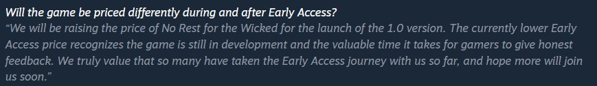 According to Mahler, No Rest for the Wicked’s price will increase from $40 to $60 once it leaves Early Access, as it’s a “premium title.” The price increase was already confirmed earlier, and it is clearly mentioned on the game’s Steam page.