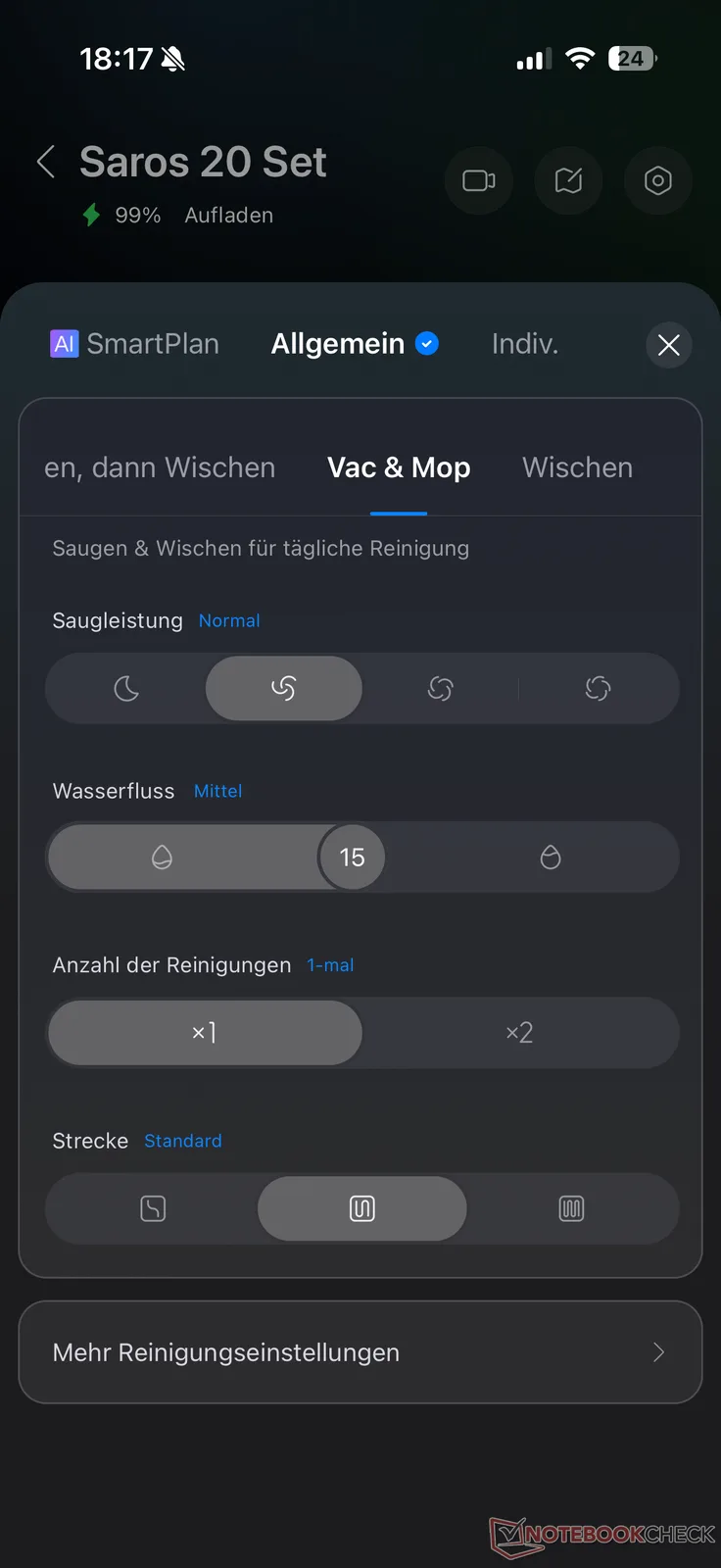The Roborock app offers four cleaning options for the Saros 20: "Vacuum and mop", "Vacuum first, then mop" and "Vacuum only" and "Mop only". Various options are available for both cleaning modes. For example, the suction power can be adjusted in the usual four stages and the mopping moisture in 30 stages. AI SmartPlan is also available as an alternative to the modes. Here, the robot adapts itself better and better to the conditions, controlled by AI.