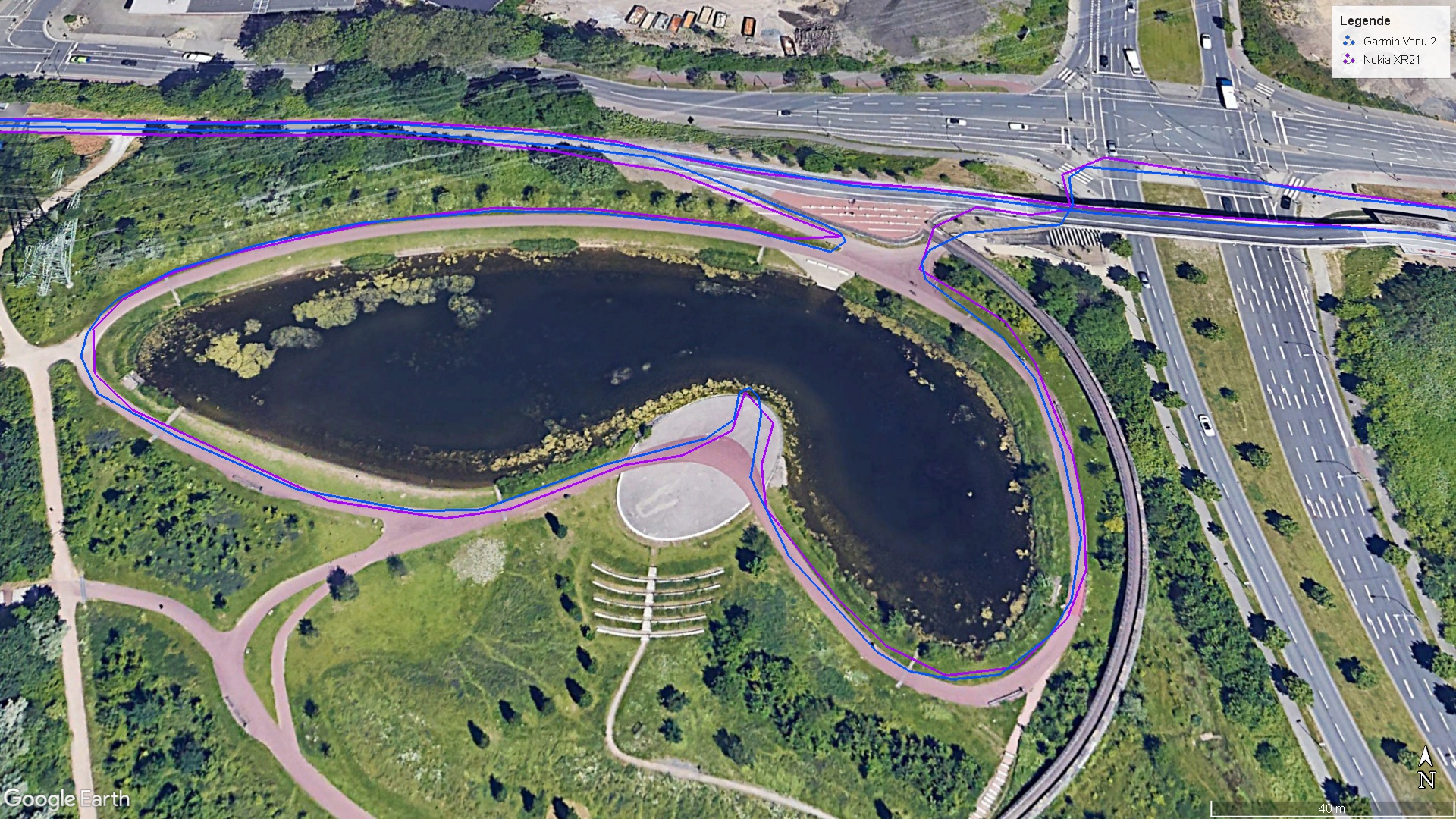 We compare the smartphone with a Garmin Venu 2 on a short bike ride. The difference in the recorded route is 60 meters (~197 ft) over an almost 10 km (~6,2 miles) total route, but XR21 reported a significantly higher amount of altitude traversed. The route recording is fairly accurate in the detail view, allowing us to attest the Nokia smartphone with good locating capabilities.