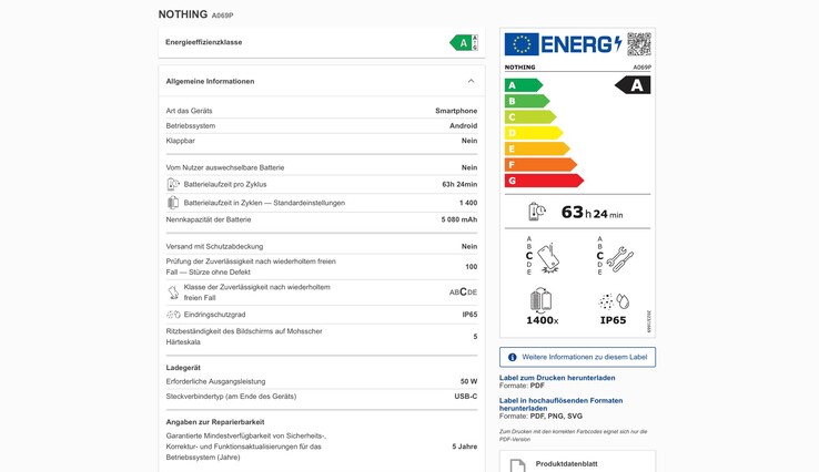 According to the listing, the battery capacity will increase only slightly from 5,000 mAh to 5,080 mAh, and charging will continue to be via USB-C with up to 50 watts. Based on the EU energy label's less stringent testing criteria, a battery life of over 63 hours should be possible. The battery is expected to last for 1,400 charge cycles before its remaining capacity drops below 80%.