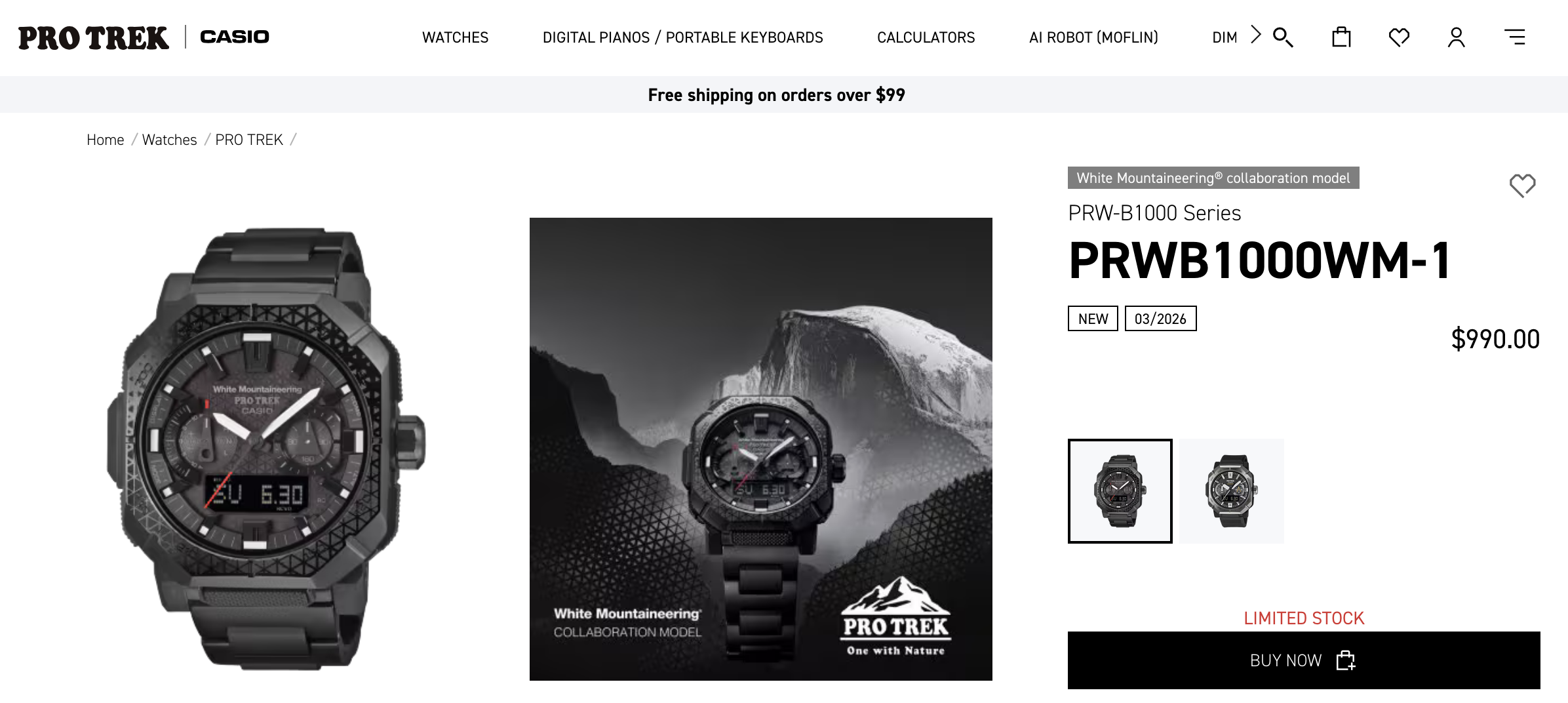 Casio’s recently announced Pro Trek collaboration with White Mountaineering is now available to buy in the US, with listings showing limited stock for the PRW-B1000WM-1. The model was introduced earlier this year, and retail pages now confirm pricing at $990.