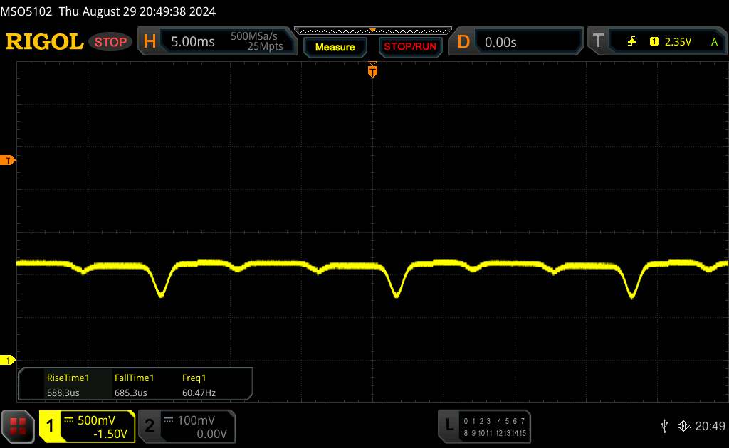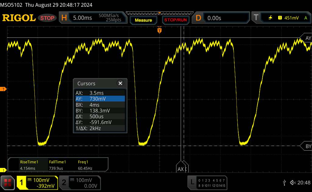 Under the oscilloscope, the OLED panel flickers at a steady 60 Hz, showing an extremely uniform amplitude curve. Nubia claims the display uses PWM dimming with up to 2,160 Hz, and our manual measurements largely confirm this. At minimum brightness, we detect a 2,000 Hz flicker rate.