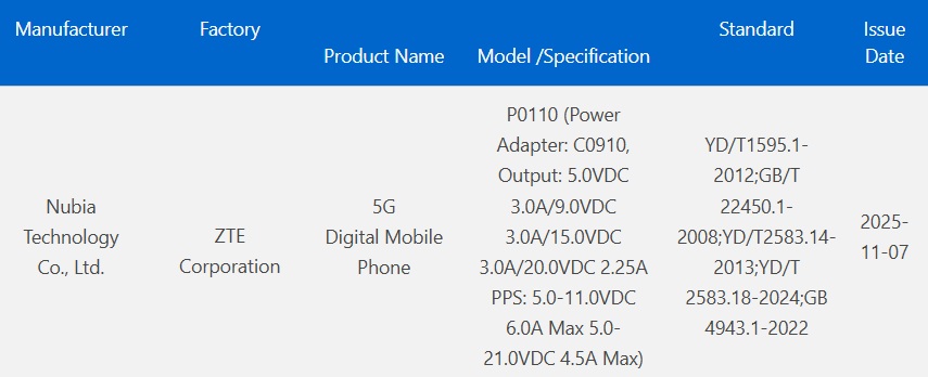 The smartphone’s 3C certification, issued recently, reveals Nubia P0110 may ship with a 94.5 charger, meaning it is a top contender in the charging department, too.