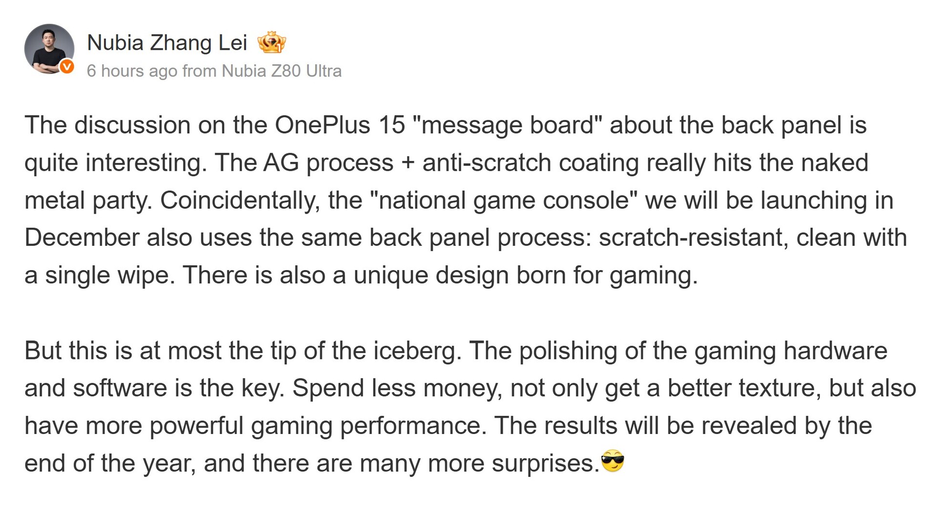 Of course, the OnePlus 15 isn't all about gaming. The company made it stand as an all-around phone that's also good for serious gamers, especially for the rear AG glass that's paired with a scratch-resistant coating. As Nubia's General Manager, Zhang Lei points out, this design element makes the new flagship smartphone more appealing to users who prefer not to use cases on their phones, who are often gamers.