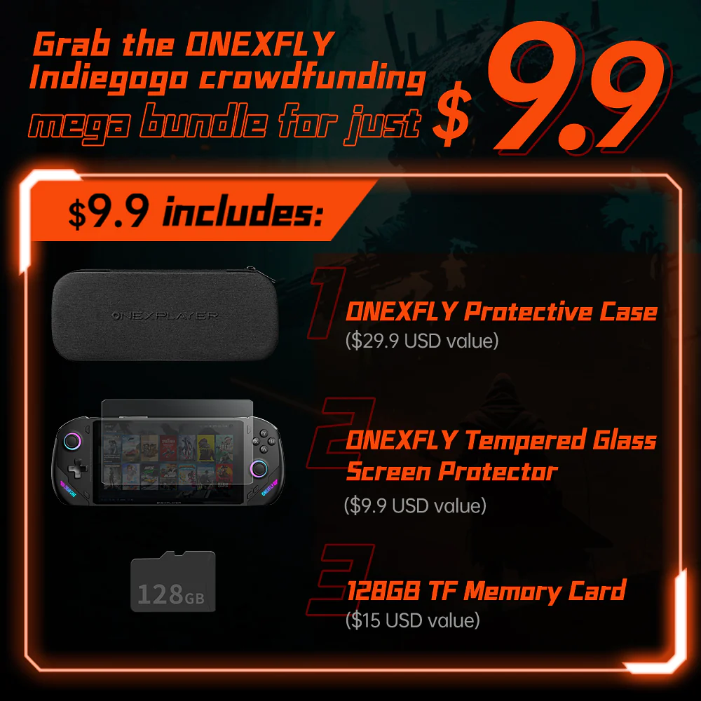 As the screenshots below show, One-netbook will only sell the gaming handheld at this price if enough people pay US$9.90 for its 'Mega Bundle', which includes a protective case, a glass screen protector and a 128 GB MicroSD card. Please note that One-netbook has not revealed ONEXFLY pricing if it fails to reach its current funding goal of 2,001 units. Also, One-netbook will only ship Mega Bundle orders if you purchase a ONEXFLY unit through its upcoming Indiegogo campaign.