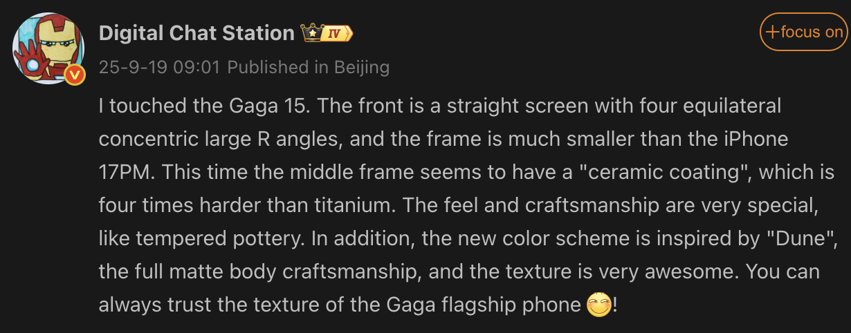 Digital Chat Station on Weibo suggests that the OnePlus 15 could feature a flat display with rounded corners and bezels thinner than the iPhone 17 Pro Max. The tipster further claims the OnePlus 15 adopts an aluminum frame with a "ceramic coating". Moreover, the phone is hinted to feature a new colorway inspired by earthy tones, paired with a matte finish.