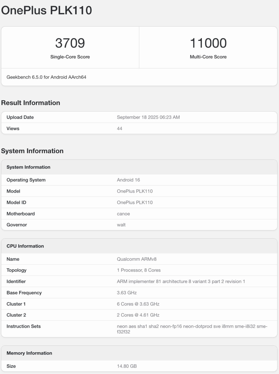 Previously, the OnePlus 15 appeared on Geekbench with a low score due to an underclocked CPU. It managed to score only 639 points in single-core and 1,871 points in multi-core tests. The latest Geekbench listing of a device with model number PLK110, which is expected to be the Chinese variant of the OnePlus 15, reveals that it has 16GB of RAM and runs Android 16. The phone with the Snapdragon 8 Elite Gen 5 chipset achieved 3,709 points in single-core and 11,000 points in multi-core tests.
