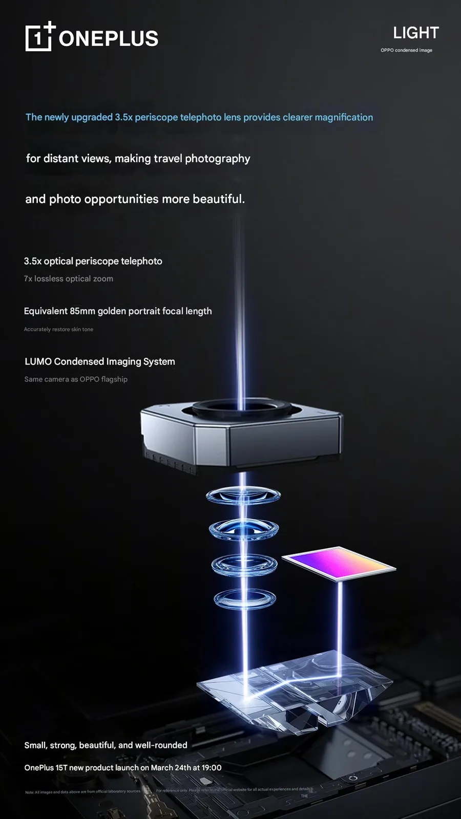In the most recent batch of teasers, OnePlus has confirmed details regarding the smartphone's camera setup. According to a Weibo post made by the brand, the OnePlus 15T will feature a 50 MP primary shooter with an f/1.8 aperture, as well as a 50 MP f/2.8 periscope telephoto camera with 3.5x optical zoom capabilities. It has also been mentioned that the primary shooter will utilize a 1/1.56-inch sensor made by Sony.