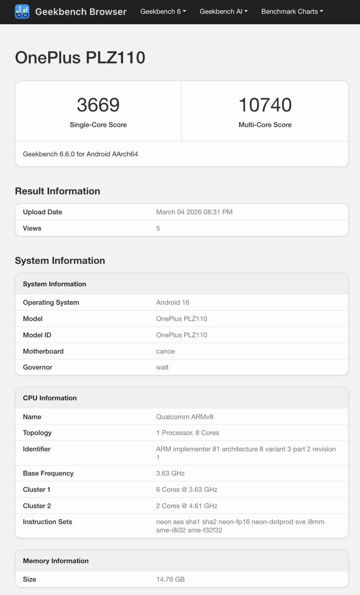 Now, what appears to be the same device has appeared on Geekbench across a few listings. As expected, the OnePlus 15T matches the OnePlus 15 with a Snapdragon 8 Elite Gen 5 chipset and 16 GB of RAM. Currently, the OnePlus 15 is one of the lowest-ranked Snapdragon 8 Elite Gen 5 devices we have tested so far.