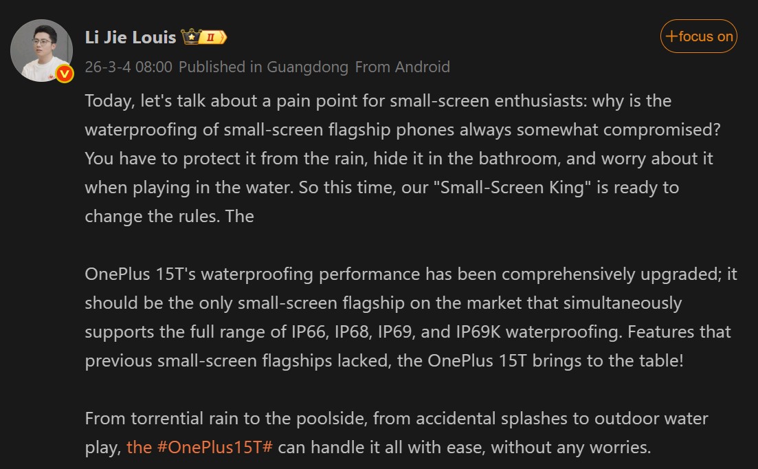 OnePlus 15T teaser reveals stronger waterproof ratings and hint at final design