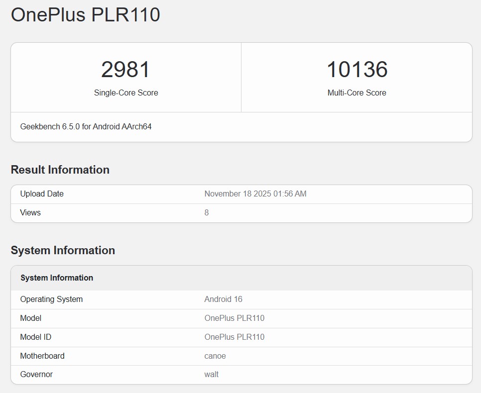 Returning to the OnePlus Ace 6T (PLR110), the device's raw scores reflect the chip's capability. The combination of Snapdragon hardware and 16GB RAM achieved a single-core score of 2,981 and a multi-core score of 10,136 in the Geekbench 6 CPU tests. These numbers place the 8 Gen 5 in a very strong position.