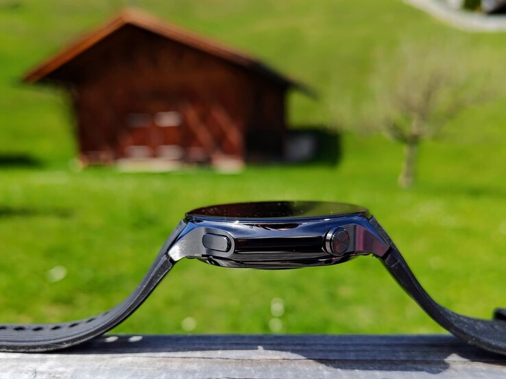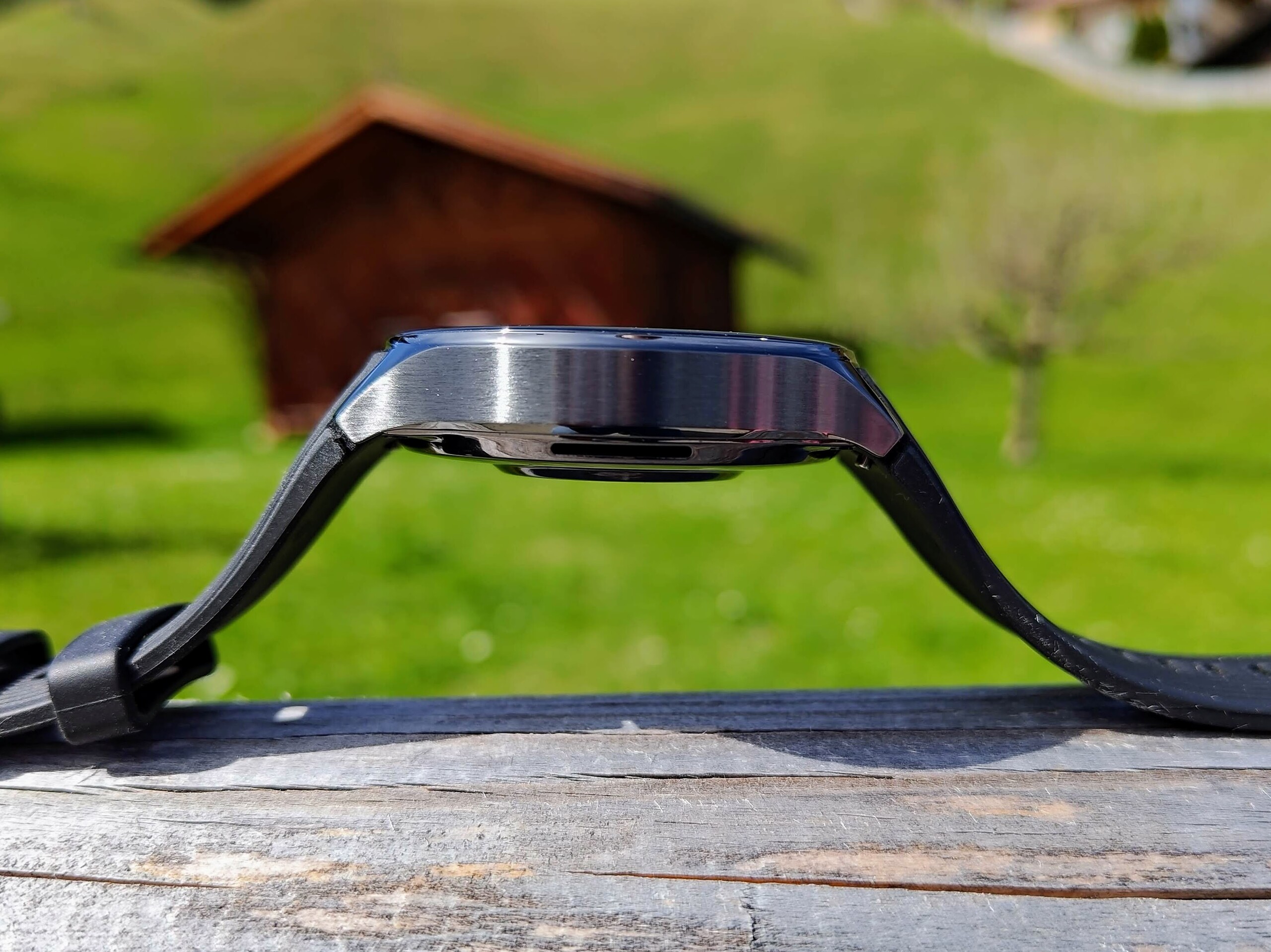 The underside is made of glass fiber-reinforced plastic. It houses numerous sensors and a metal tiller for charging. The workmanship is good and we did not scratch the smartwatch during the test period. The button and crown have a good pressure point, but there is very slight play in the casing.