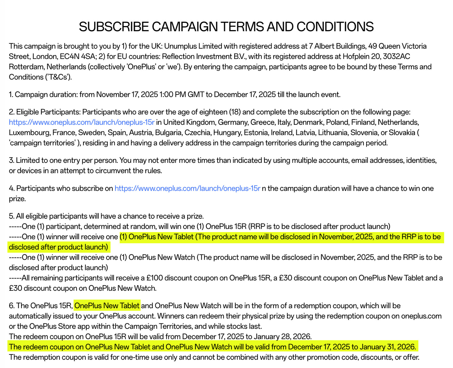Instead, OnePlus mentions a 'OnePlus New Tablet' across the campaign terms of its OnePlus 15R promotional campaign. As the screenshot below shows, OnePlus will reveal the name of this mysterious tablet later this month. Moreover, the same terms indicate that OnePlus will then go on to release the same tablet on or around December 17 before its early bird campaign ends on January 31, 2026.