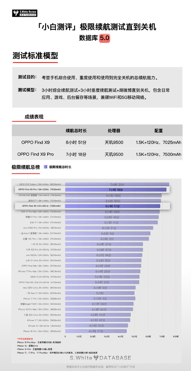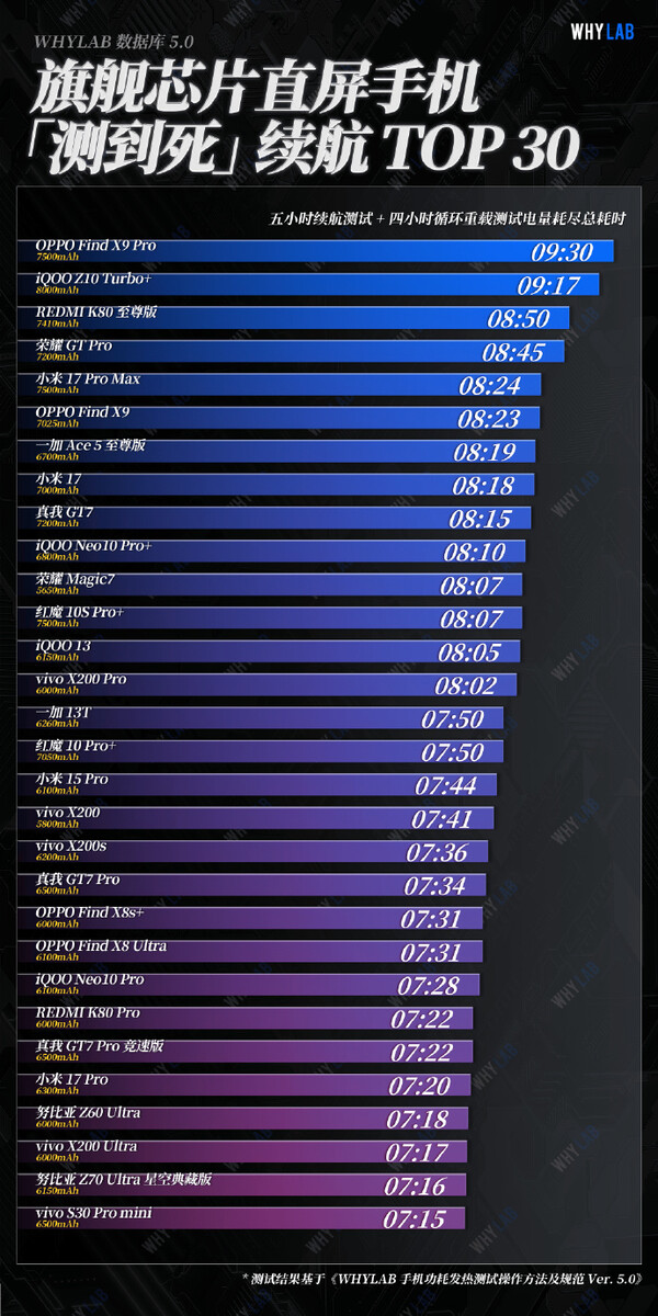 A similar series of tests by WhyLab yields identical results. The Find X9 Pro comes out on top with a total time of 9h30m, while the Xiaomi 17 Pro Max lasts just 8h24m.