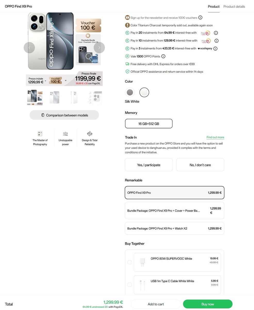 Things get more interesting in the countries where the Oppo Find X9 and Oppo Find X9 Pro are already listed for order. We checked all the European Oppo websites and discovered some interesting price differences across Europe. While the official retail price is €999 for the Oppo Find X9 and €1,299 for the Pro model everywhere, some pre-order promotions and bundle offers mean you pay significantly less in Spain than in the Netherlands, for example. Spain in particular is offering attractive deals at launch: