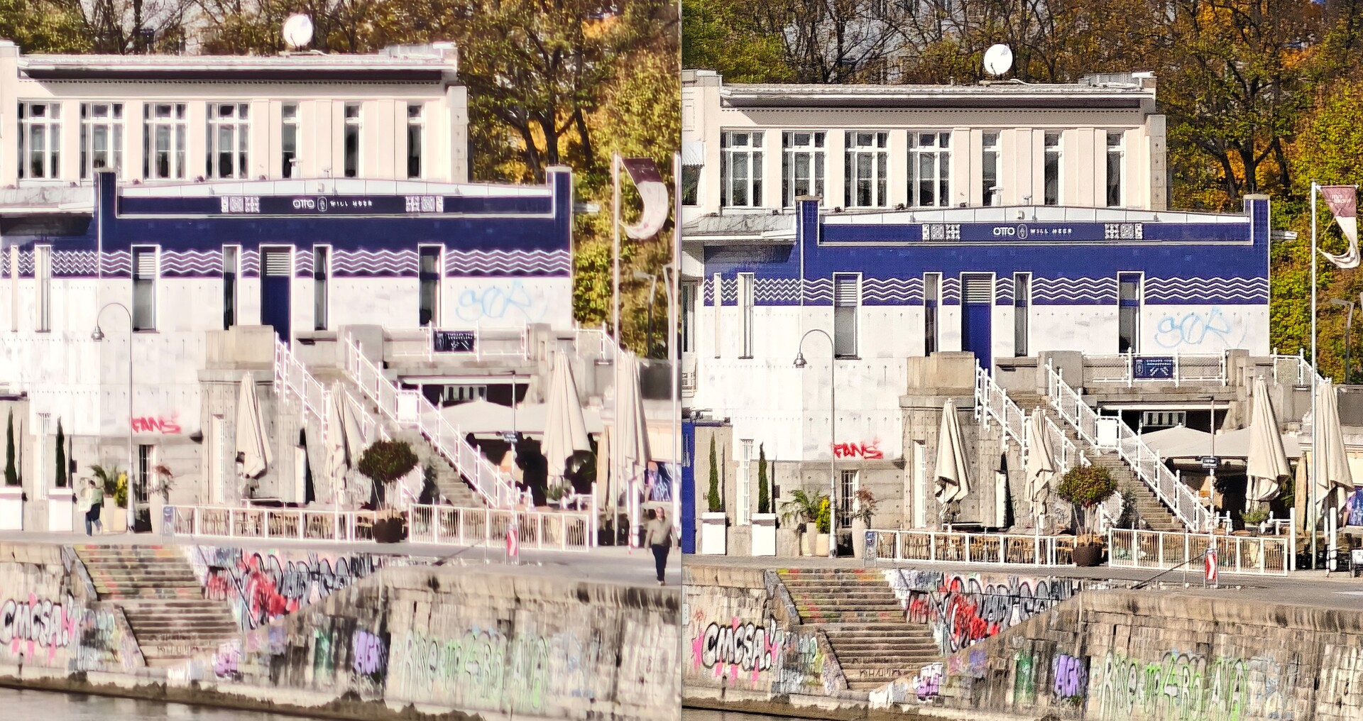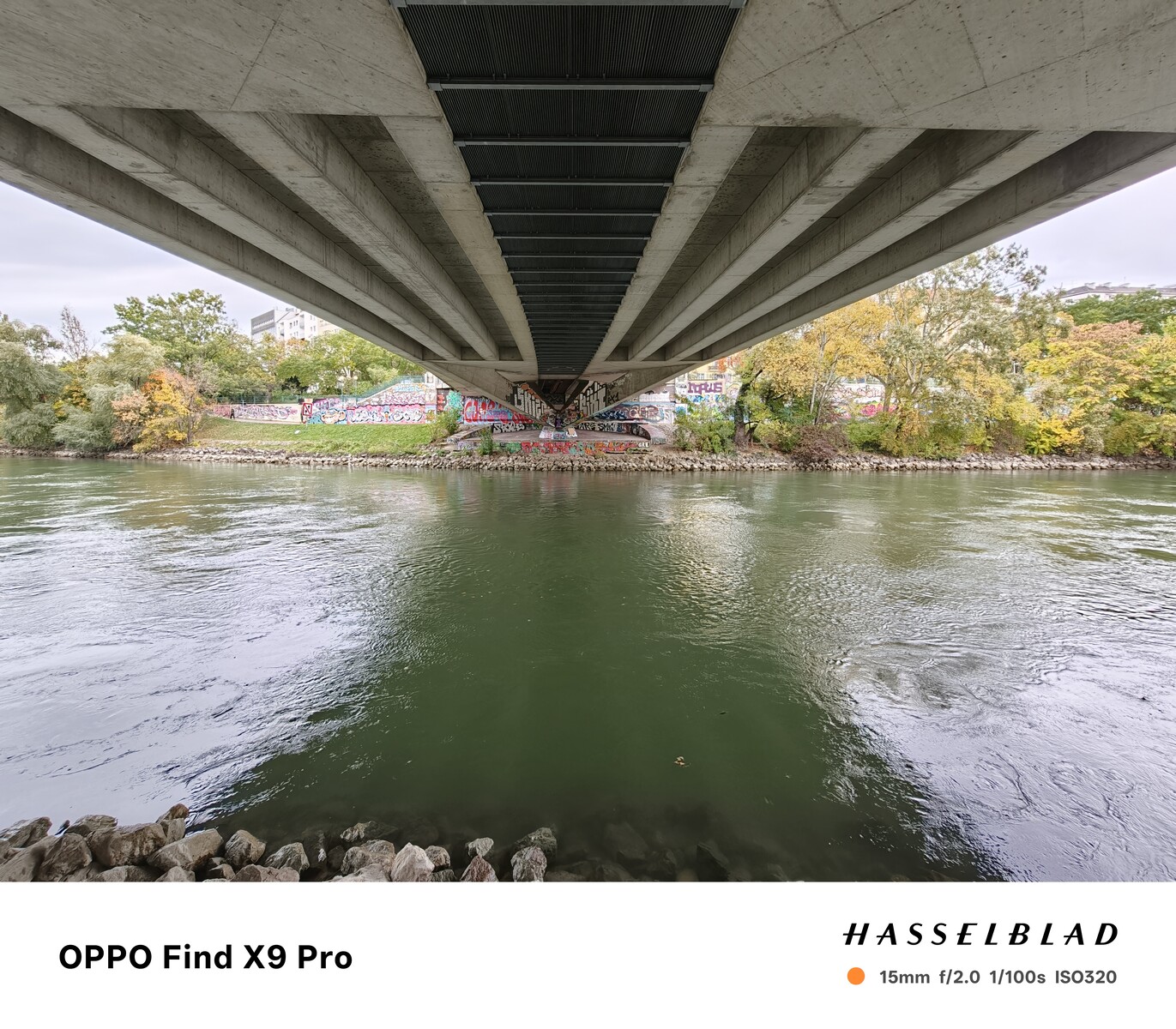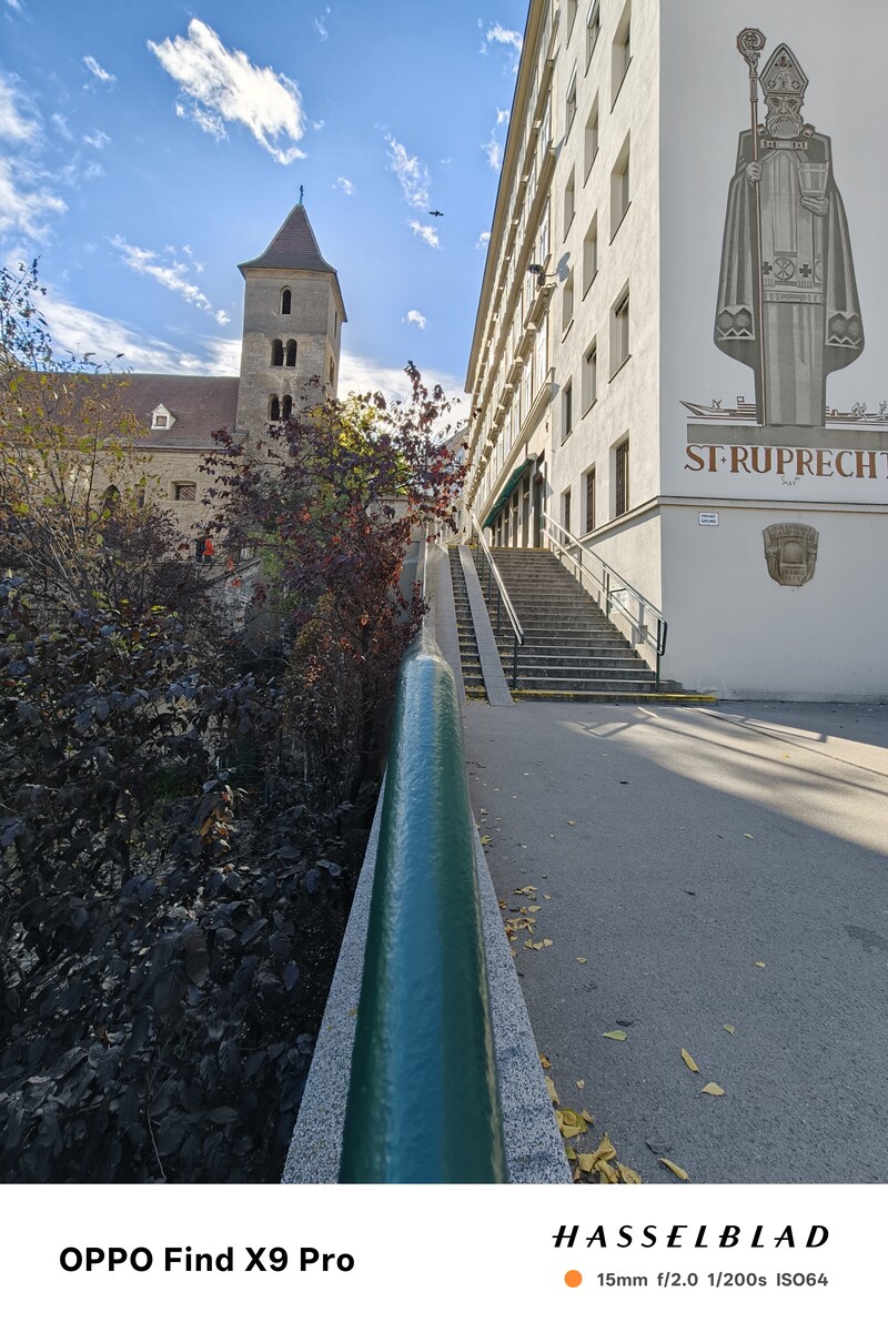 I created another crop comparison with the two pictures below. In the image of Vienna’s oldest church, the ultra-wide lens of the Oppo Find X9 Pro holds up very well against the Vivo in 50MP quality. The Zeiss camera flagship still appears slightly sharper, but in daylight, the smaller sensor of the Find X9 Pro performs impressively. The scene under the bridge shows a similar pattern. The Vivo photo looks a bit sharper, maybe even slightly over-sharpened, despite the Oppo image being 25MP. In the staircase shot, Oppo delivers a slightly warmer image, while the Vivo X200 Ultra shows a bit more noise in the zoomed-in view, which is surprising given its larger sensor.