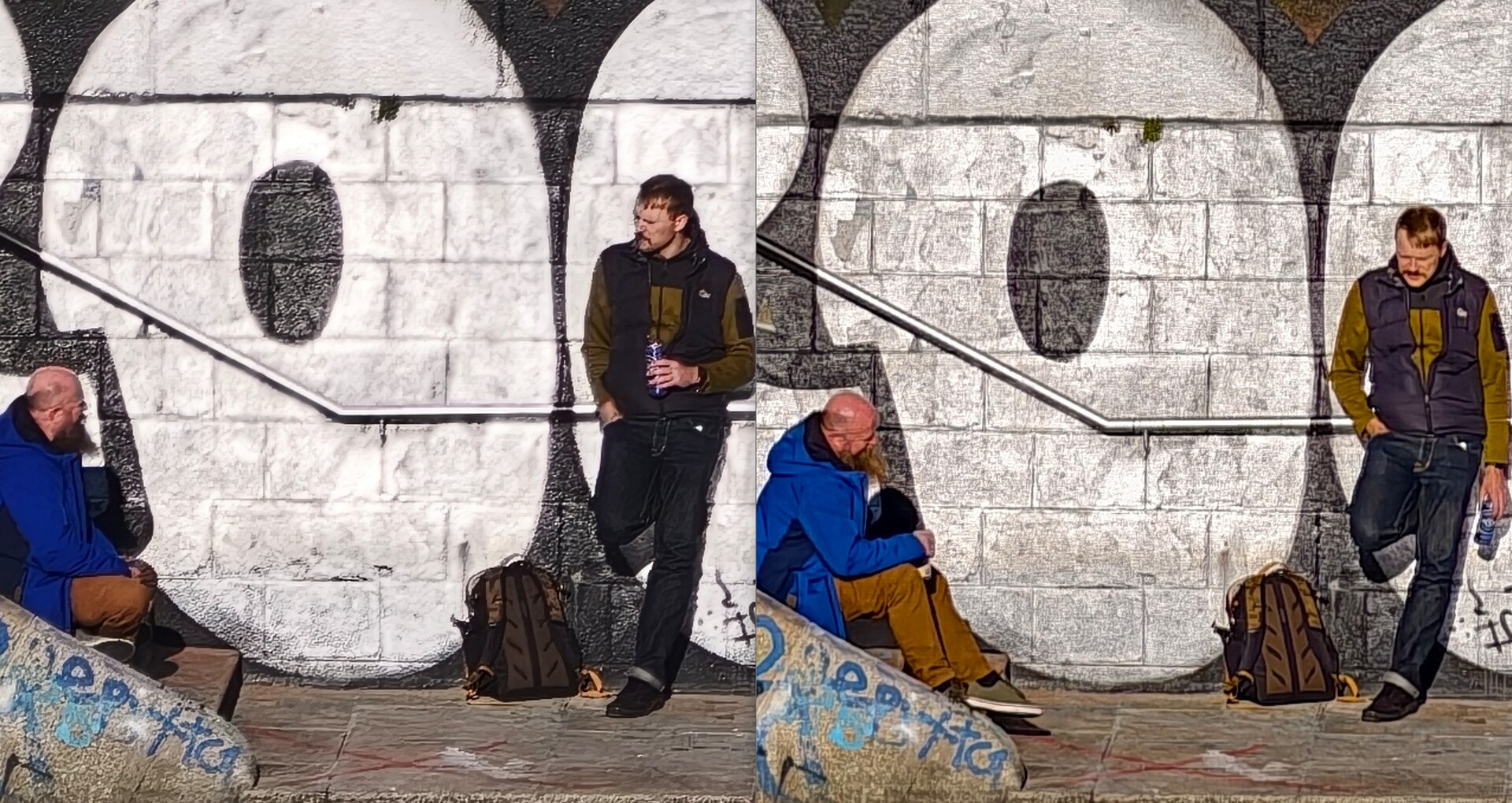 The two people in the second comparison look more like caricatures than real persons, but that’s a common issue with smartphones and becomes even more pronounced with AI processing at higher zoom levels. The wall in the background shows another difference, as the Vivo flagship reveals more texture details, while the Oppo blurs most of that, likely due to stronger noise reduction. It’s also interesting how different the colors of the backpack appear in the zoomed-in view. Unfortunately, I no longer remember which version is more accurate.