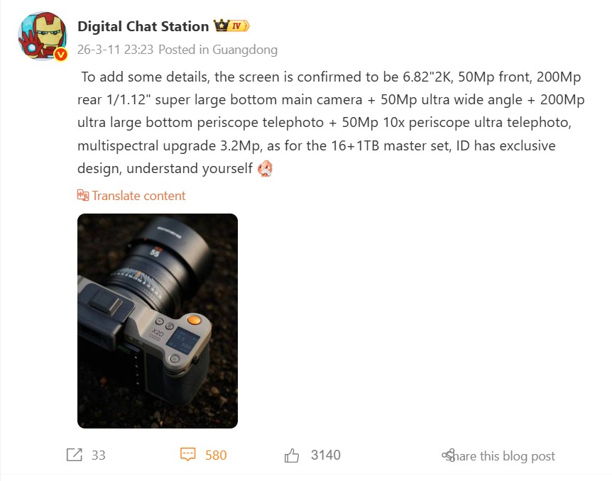 The details shared by Digital Chat Station about the Oppo Find X9 Ultra seem more credible by comparison. Many of the specifications mentioned in the leaker’s recent Weibo post have circulated before, including the 200MP 1/1.12-inch main camera, which is likely to use the same Sony LYT-901 sensor confirmed for the Vivo X300 Ultra. Alongside a second 200MP periscope telephoto lens (3x), a 50MP periscope telephoto lens (10x), and a 50MP ultrawide camera, the Find X9 Ultra will reportedly feature a multispectral sensor like its predecessor (upgraded to 3.2MP according to the leaker), a 6.82-inch 2K display, and a 50MP front-facing camera. One notable new detail is the suggestion that Oppo may release a Master Edition, rumoured to feature 16 GB of RAM, 1 TB of storage, and an exclusive design. The final design remains unknown, though Oppo could draw inspiration from the Hasselblad X2D camera, as shown in the leaker’s Weibo post.