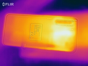 (-) The maximum temperature on the upper side is 45.3 °C / 114 F, compared to the average of 35.2 °C / 95 F, ranging from 21.9 to 247 °C for the class Smartphone.